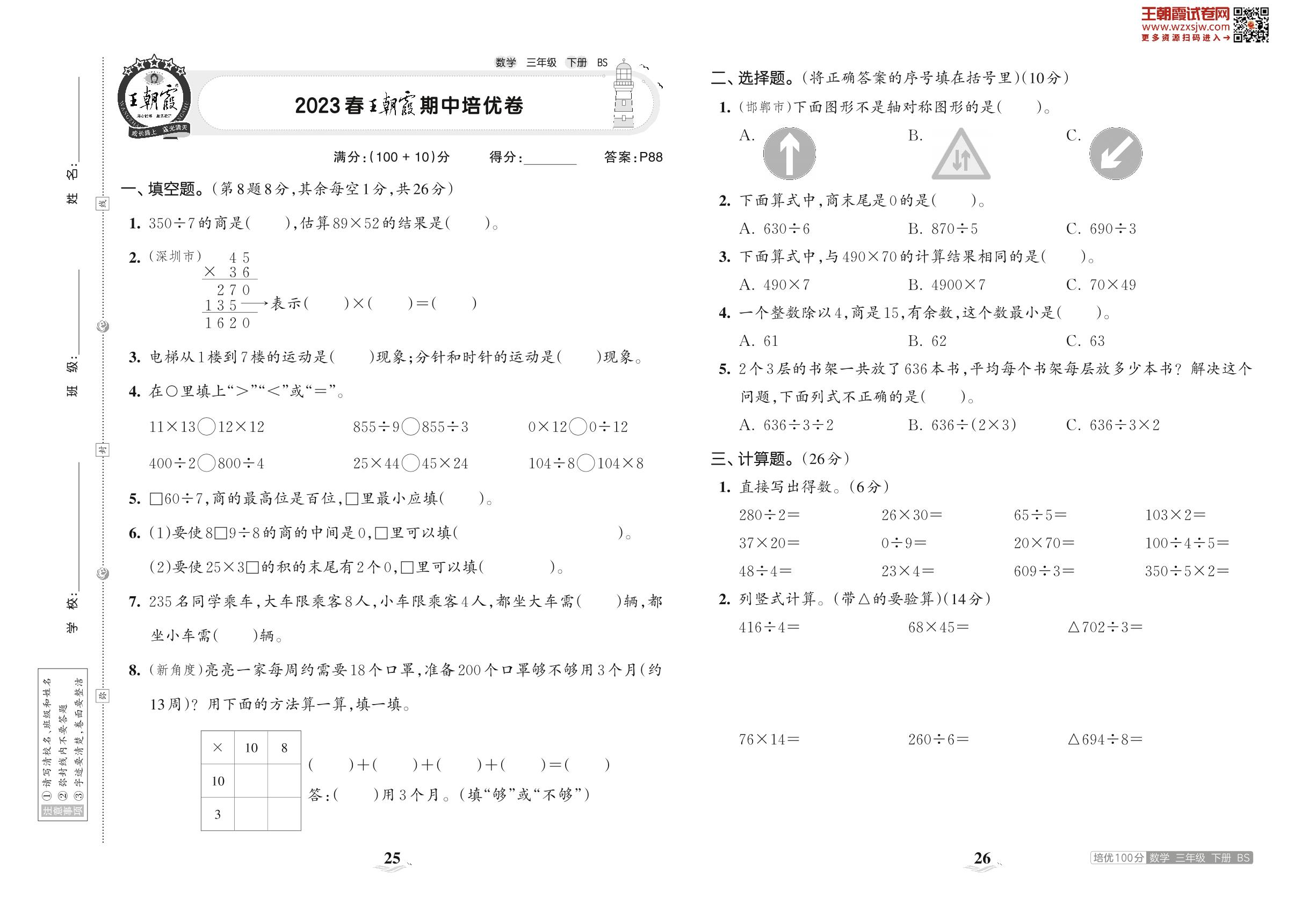 2023下册三年级数学北师版 2023春王朝霞期中培优卷