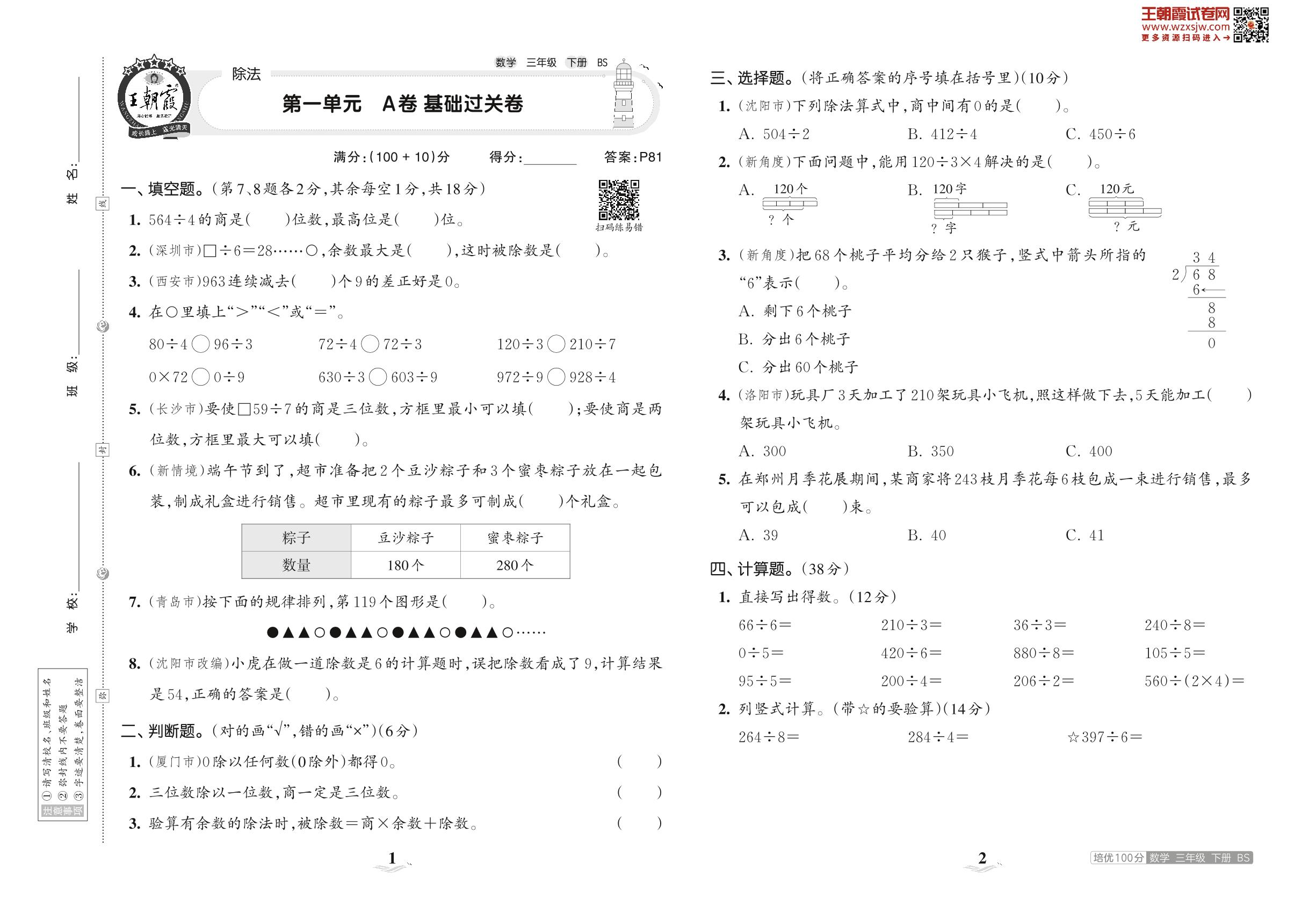 2023下册三年级数学北师版 第一单元 A卷 基础过关卷