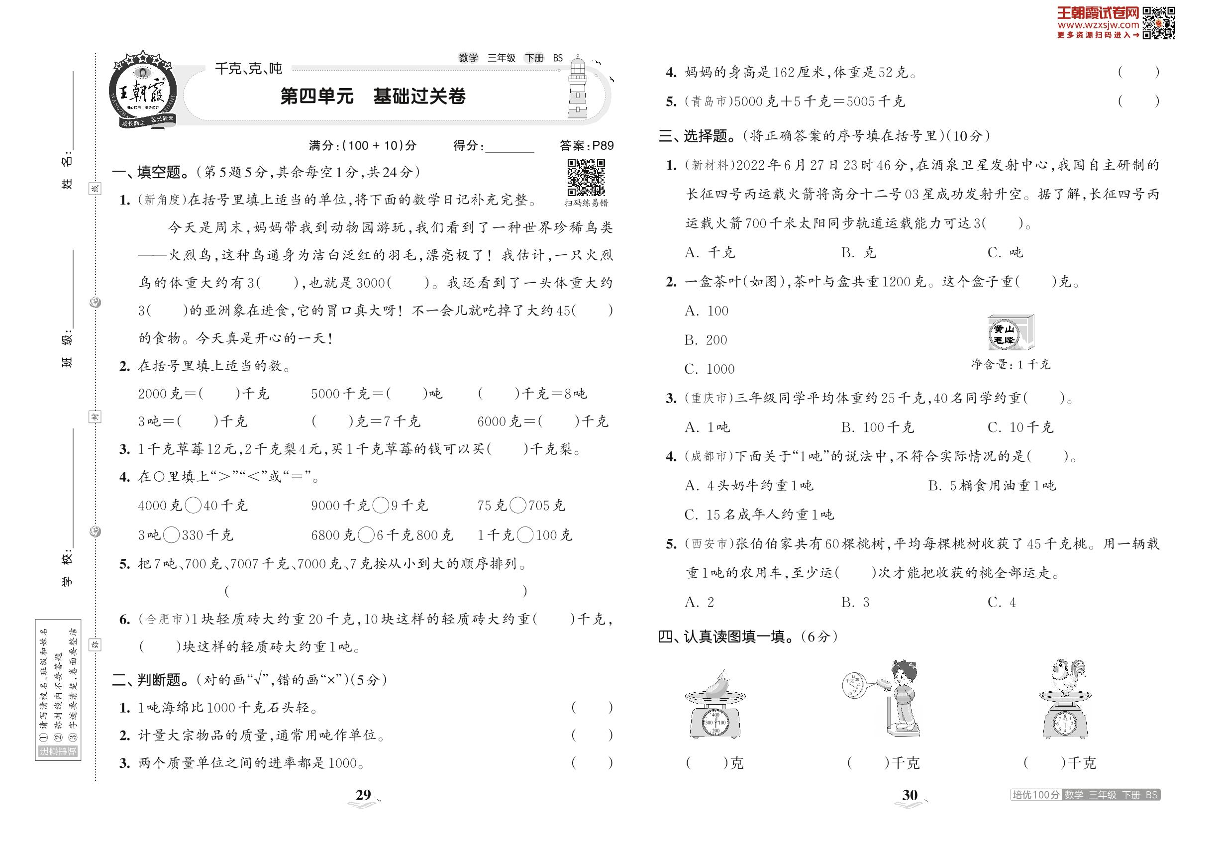 2023下册三年级数学北师版 第四单元 基础过关卷