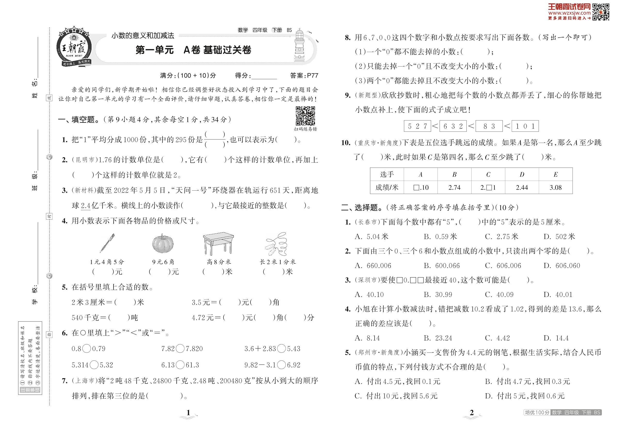 2023下册四年级数学北师版 第一单元 A卷 基础过关卷