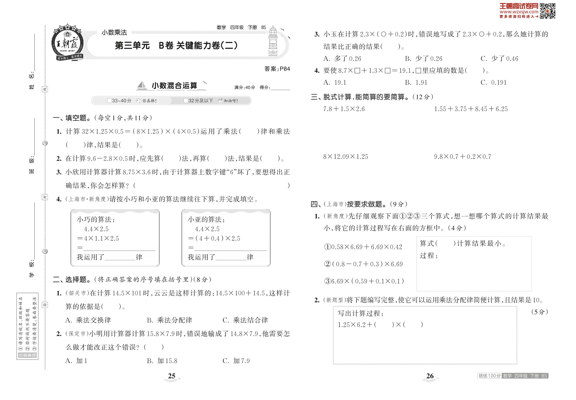 2023下册四年级数学北师版 第三单元 B卷 关键能力卷(二)