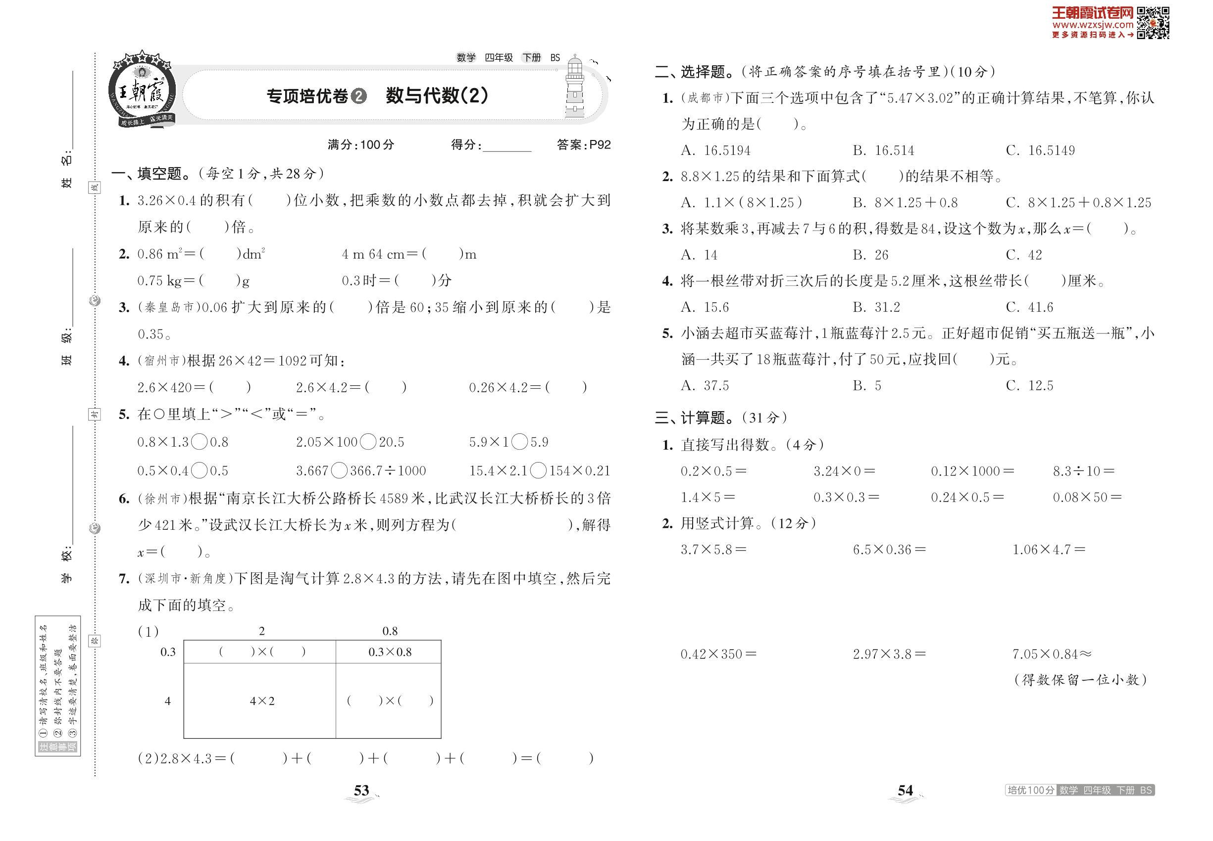 2023下册四年级数学北师版 专项培优卷2 数与代数(2)