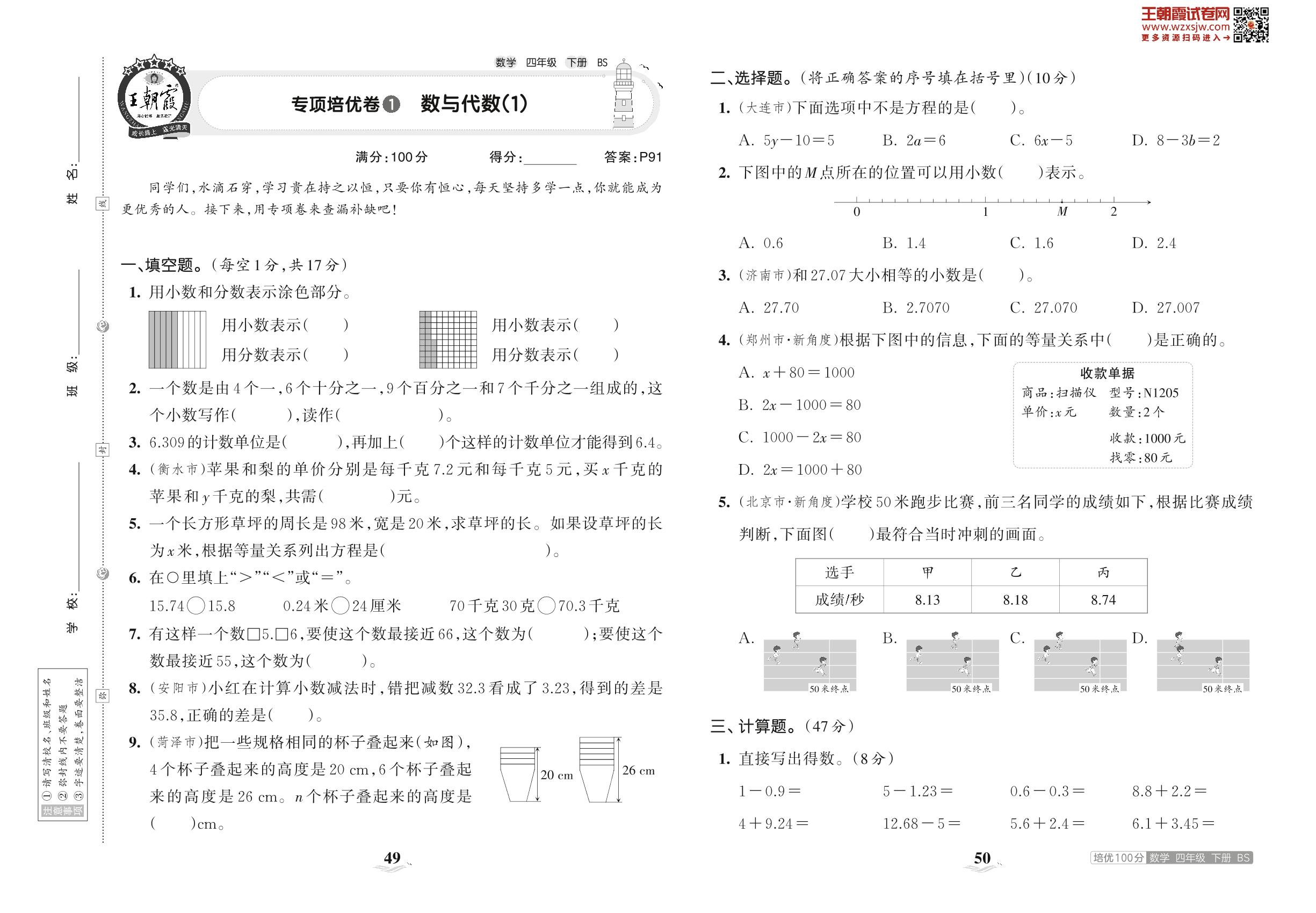 2023下册四年级数学北师版 专项培优卷1 数与代数(1)