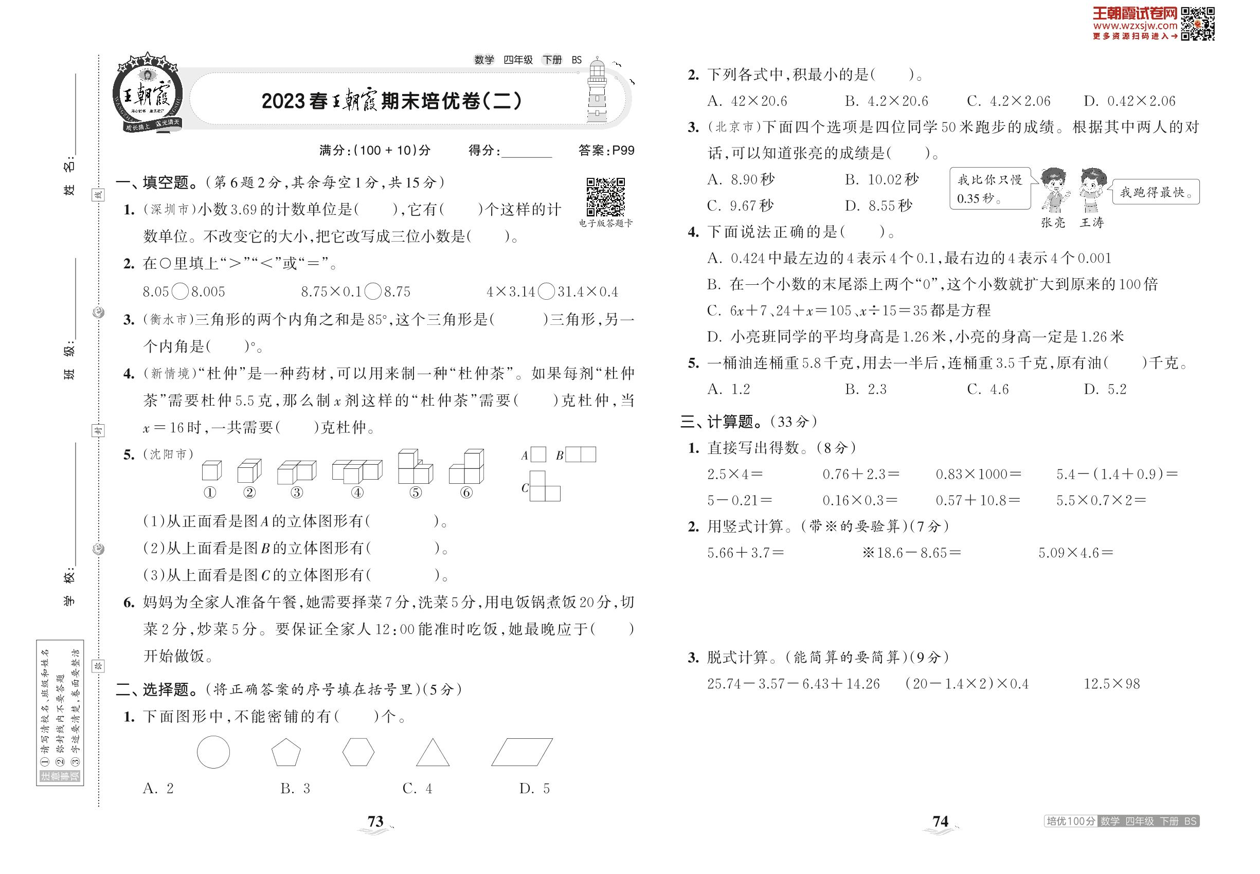 2023下册四年级数学北师版 2023春王朝霞期末培优卷(二)