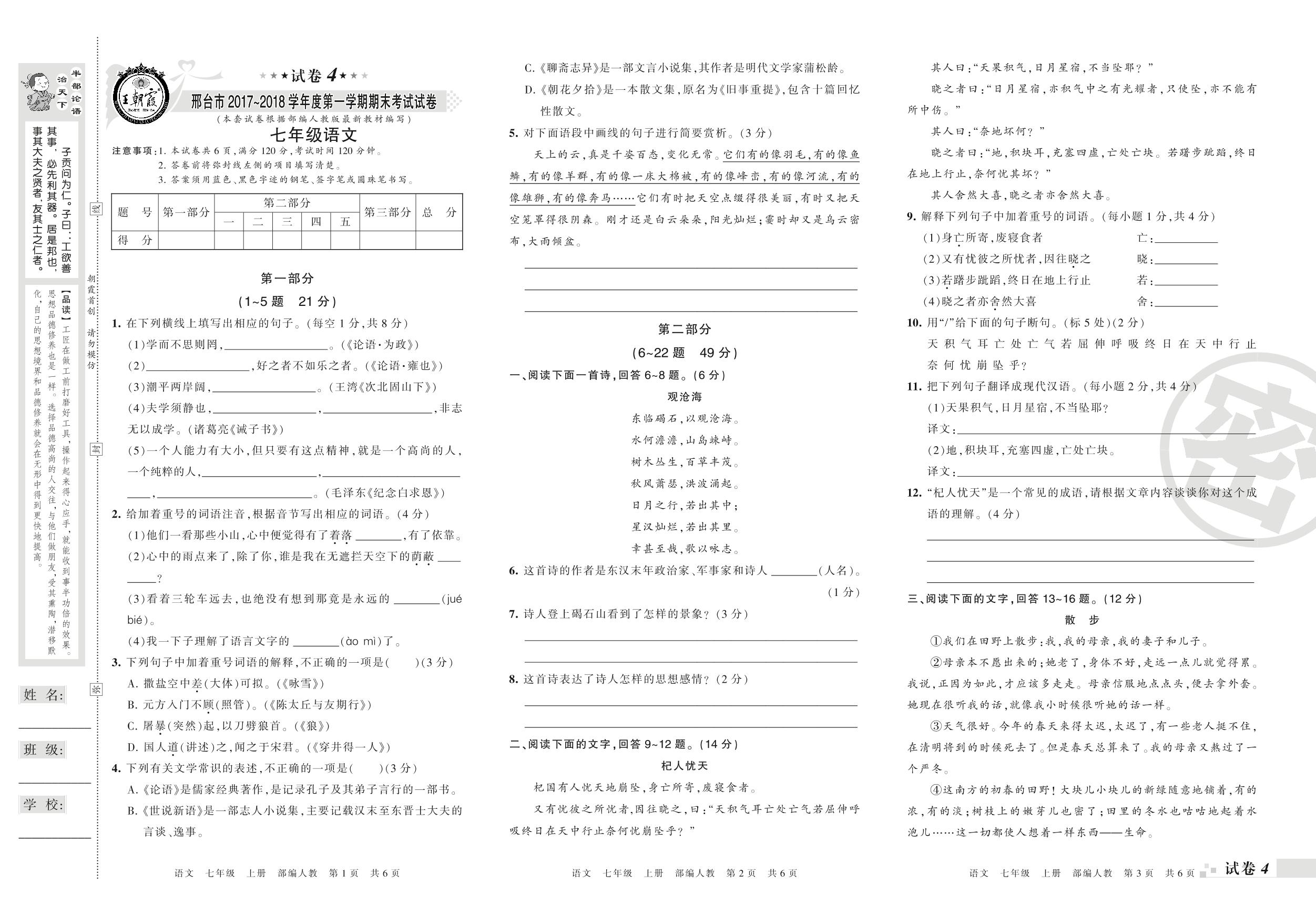 2017-2018学年第一学期邢台市七年级语文试卷(人教版)【4】