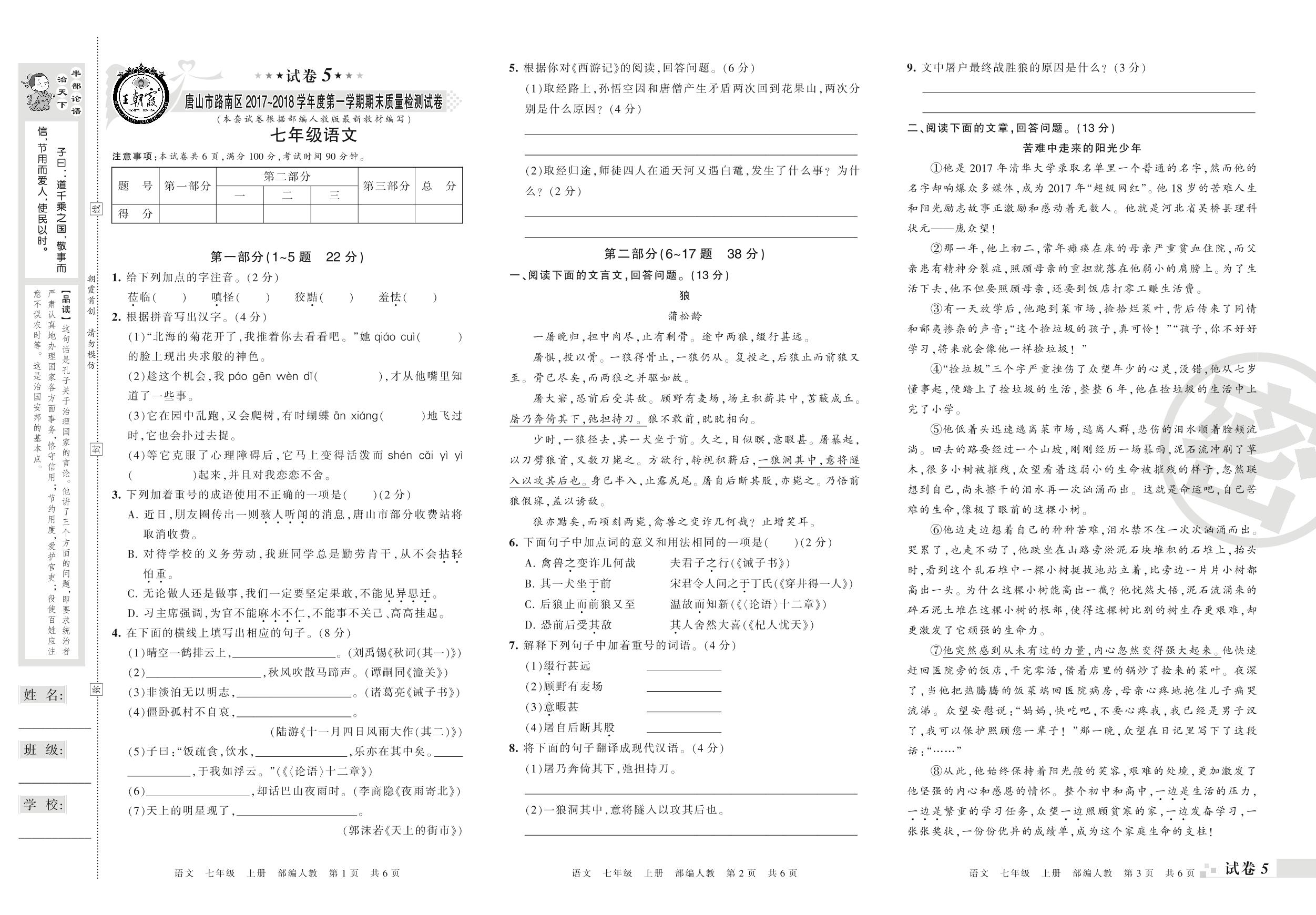 2017-2018学年第一学期唐山市路南区七年级语文试卷(人教版)【5】