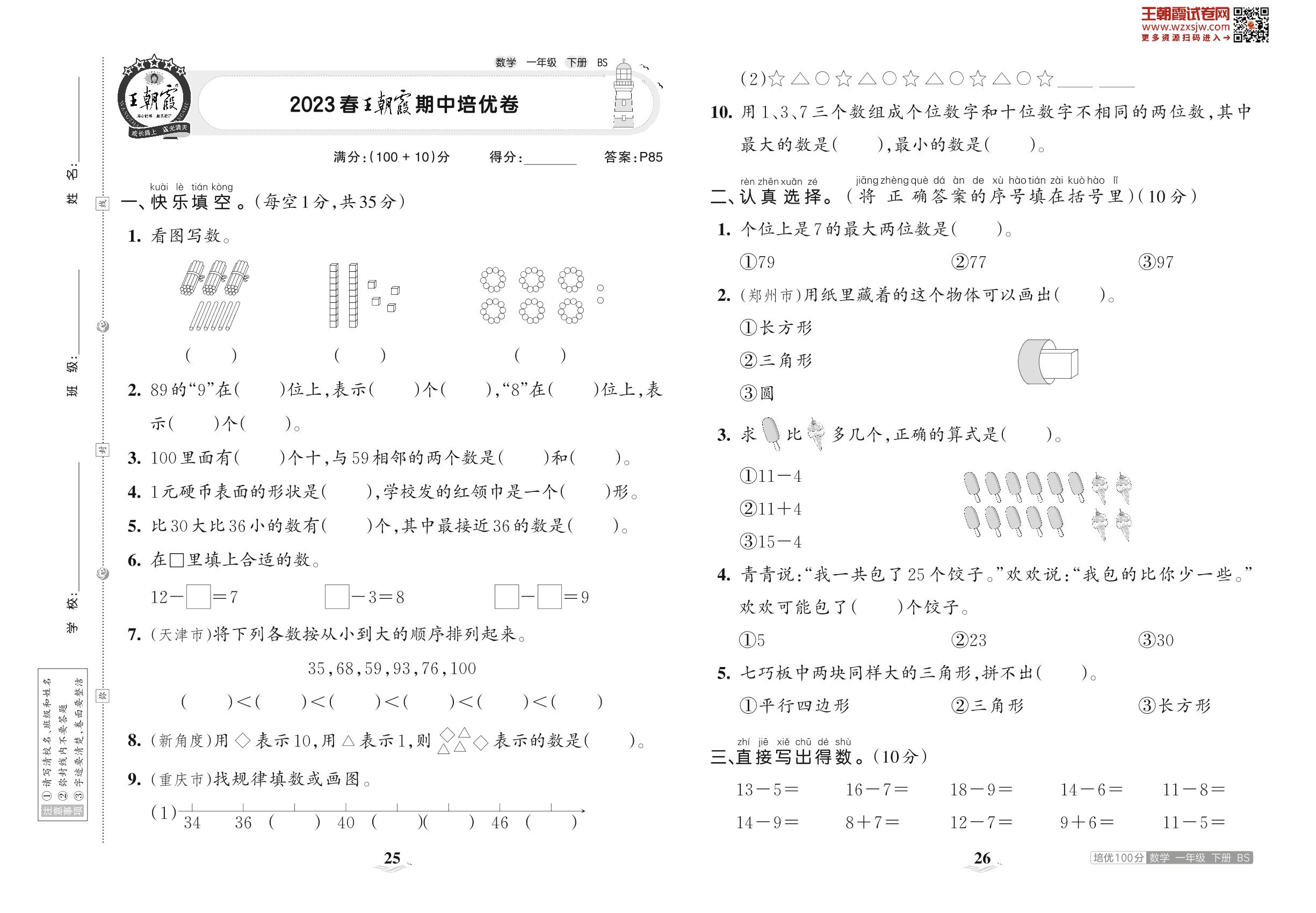 2023下册一年级数学北师版 2023春王朝霞期中培优卷