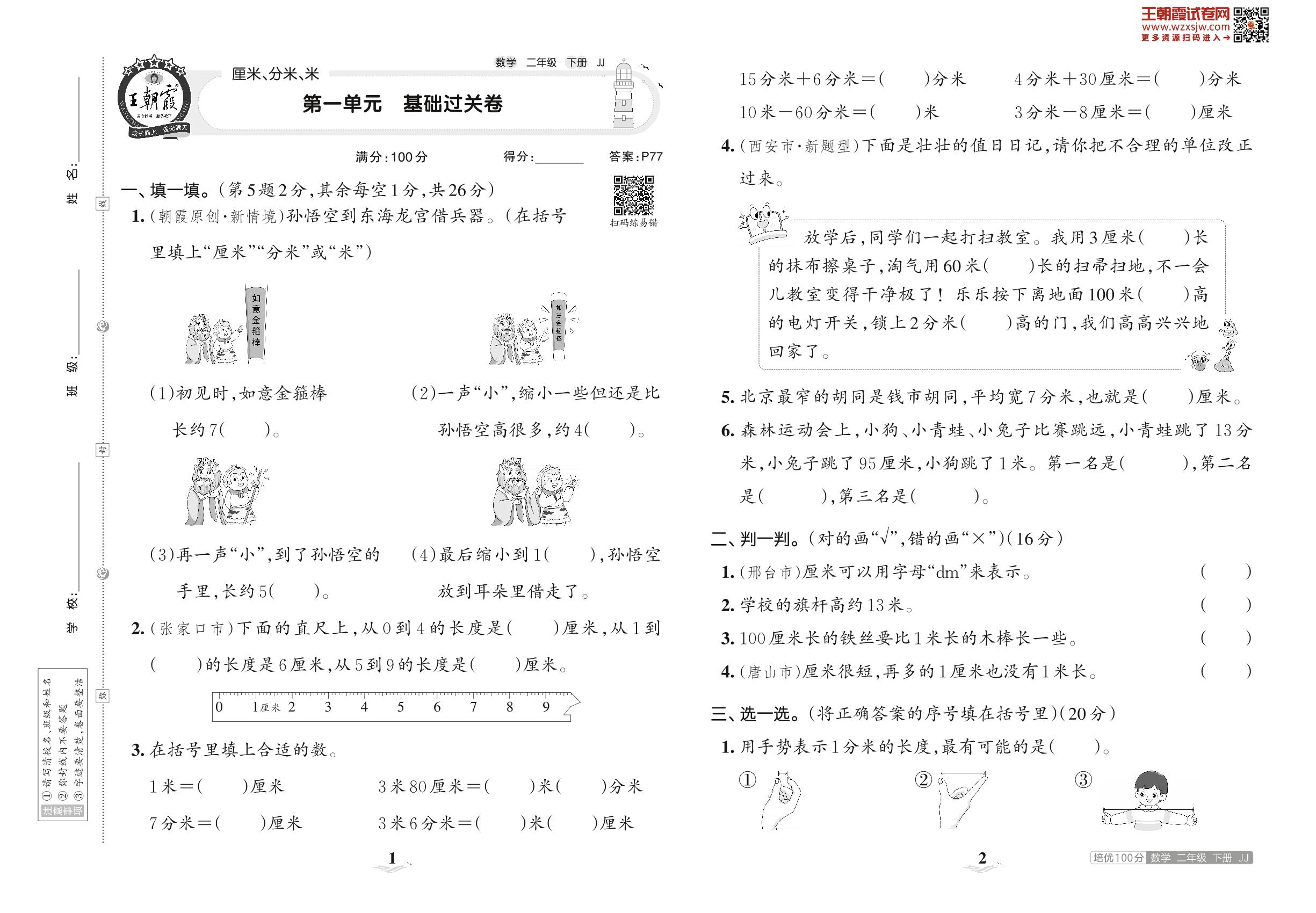 2023下册二年级数学冀教版 第一单元 基础过关卷
