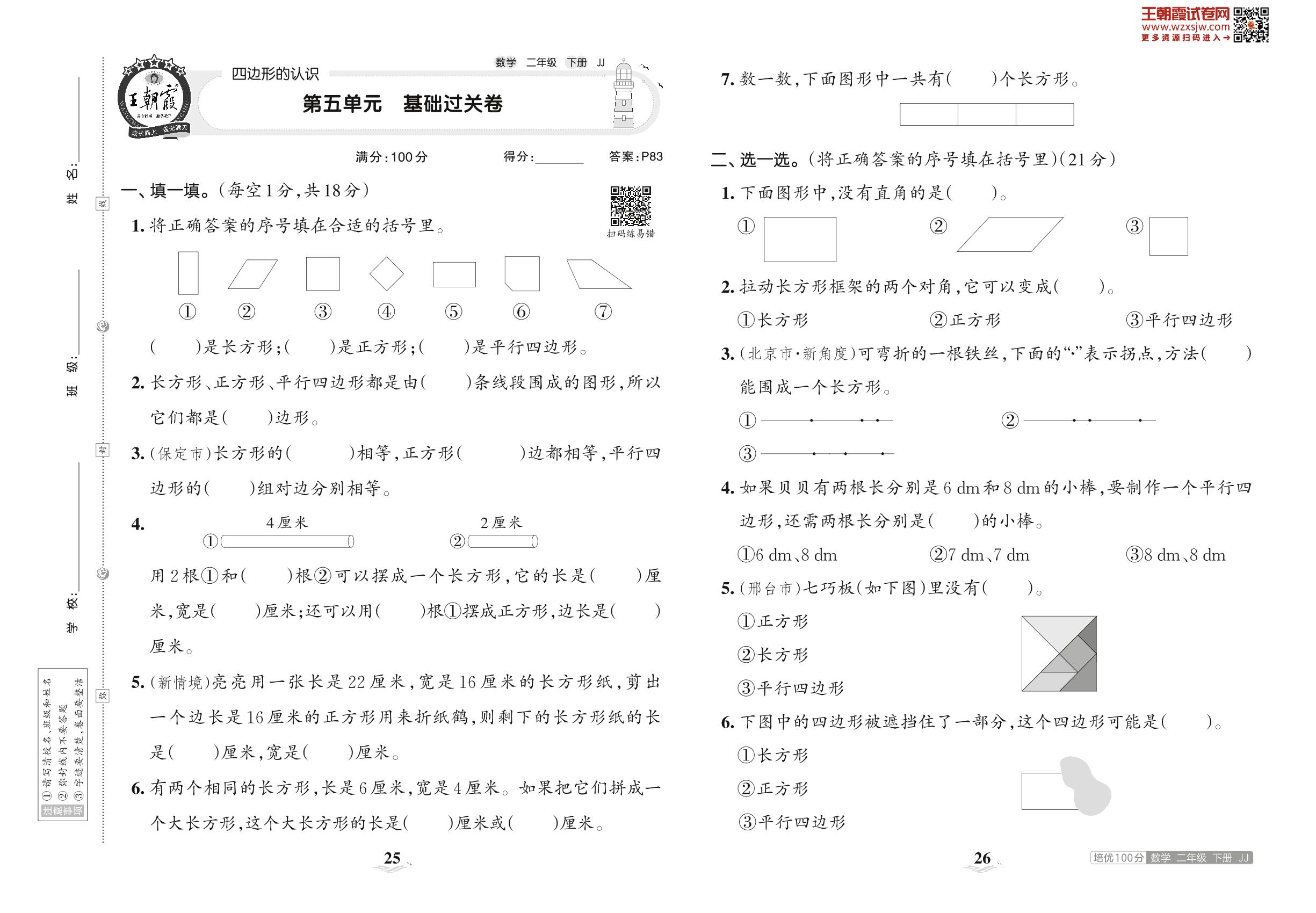 2023下册二年级数学冀教版 第五单元 基础过关卷