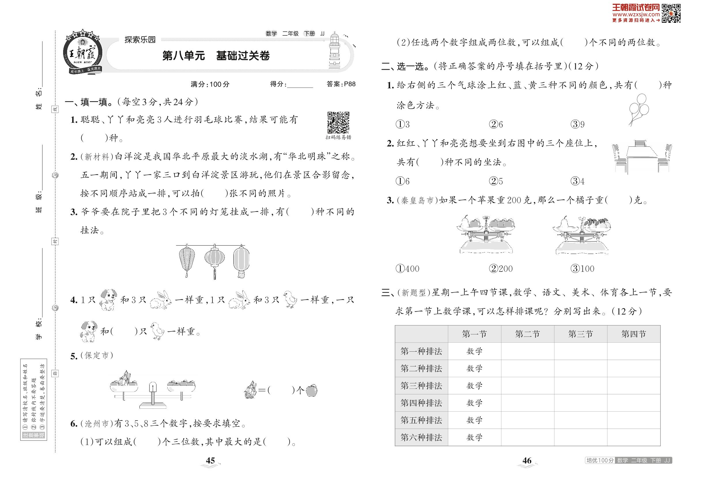 2023下册二年级数学冀教版 第八单元 基础过关卷