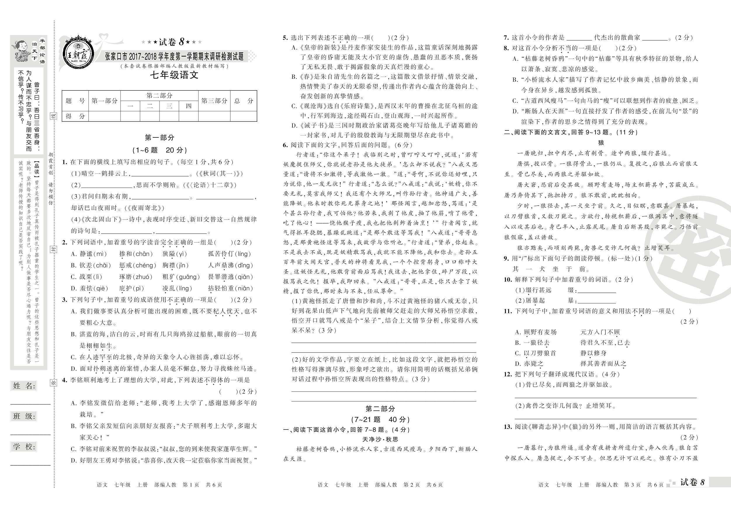 2017-2018学年第一学期张家口市七年级语文试卷(人教版)【8】