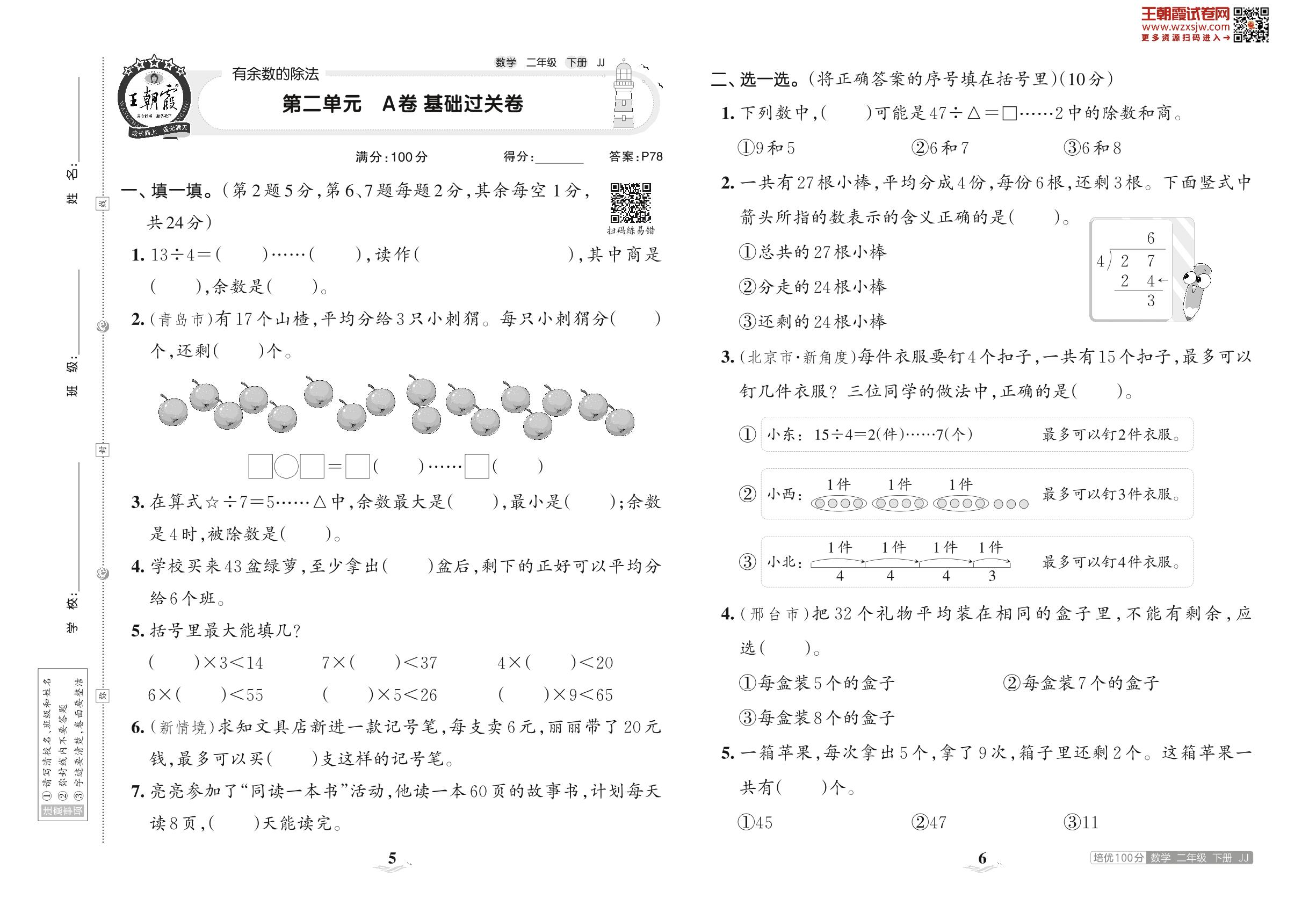 2023下册二年级数学冀教版 第二单元 A卷 基础过关卷