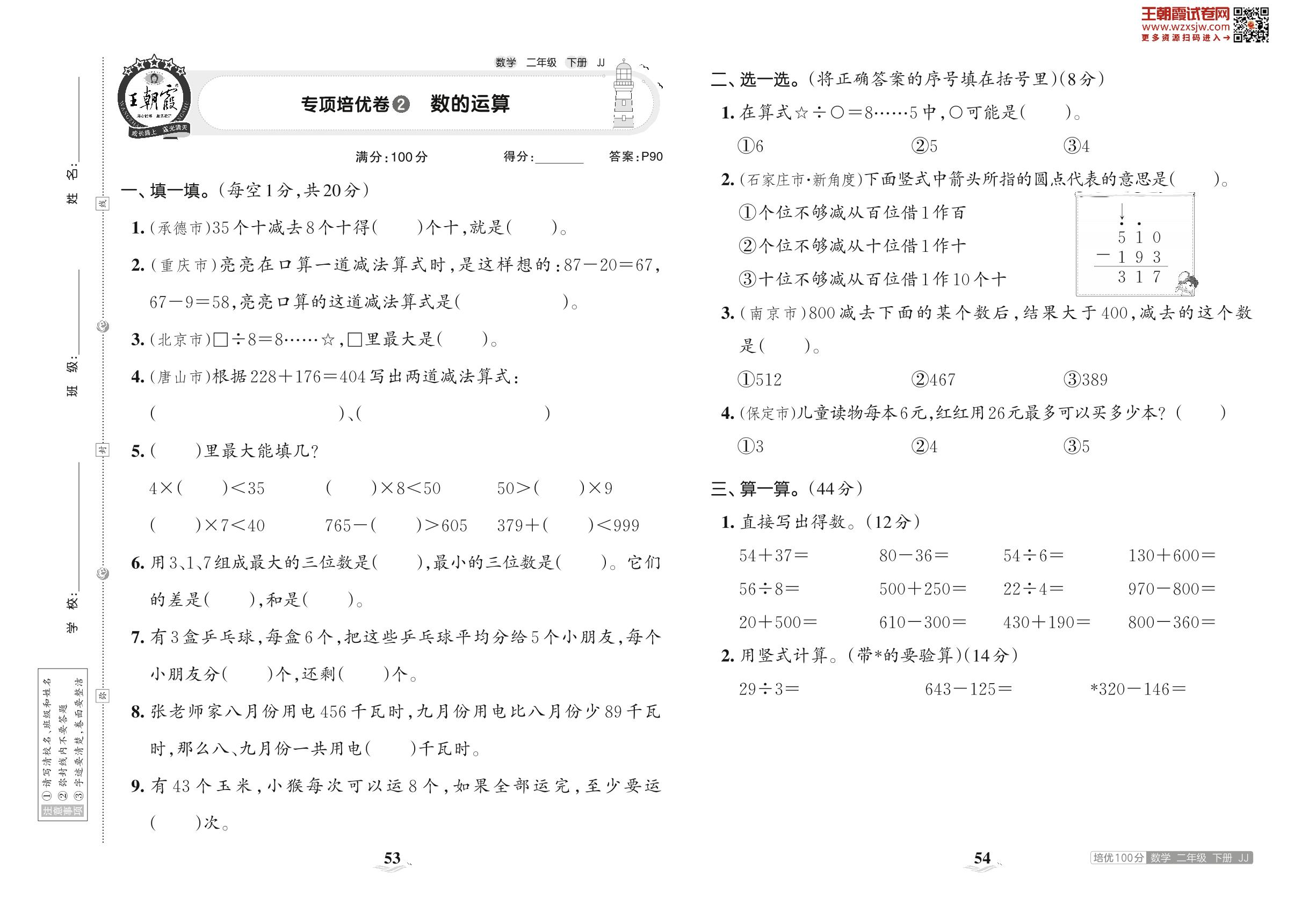 2023下册二年级数学冀教版 专项培优卷2 数的运算