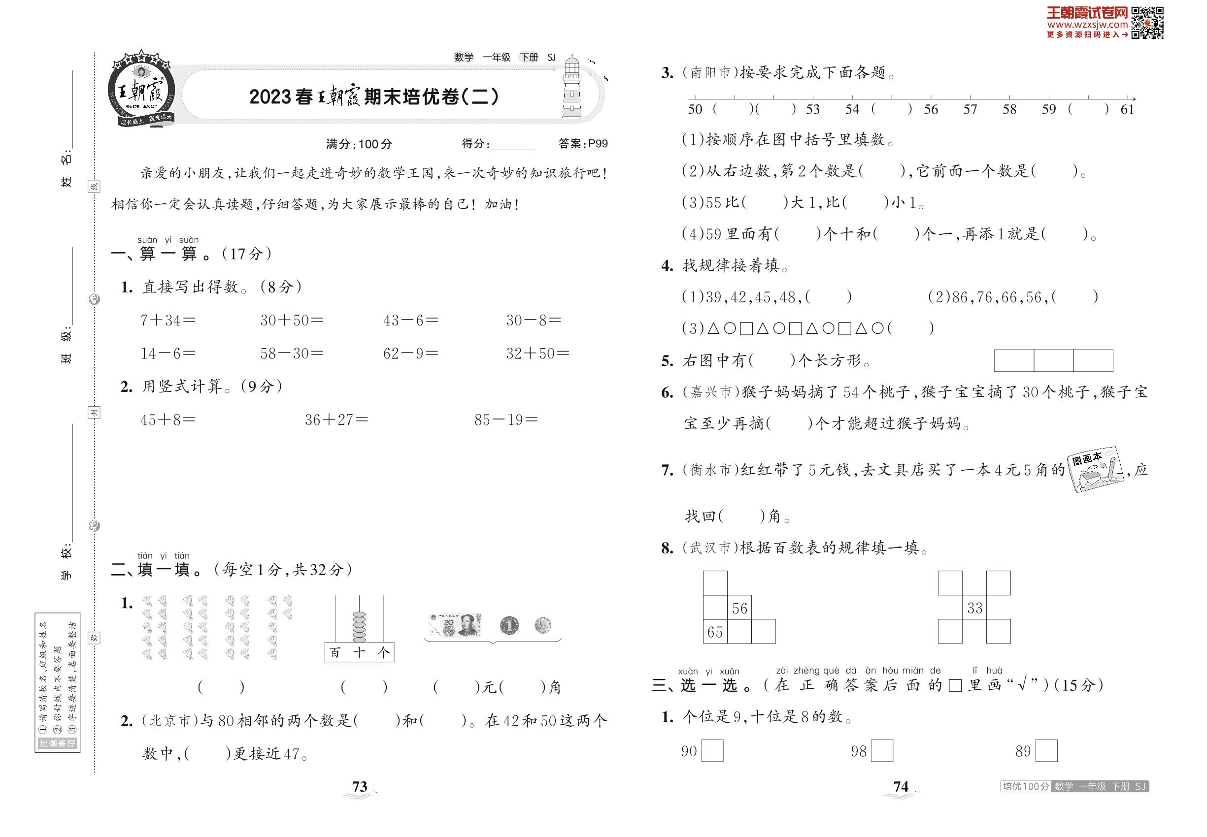 2023下册一年级数学苏教版 2023春王朝霞期末培优卷(二)