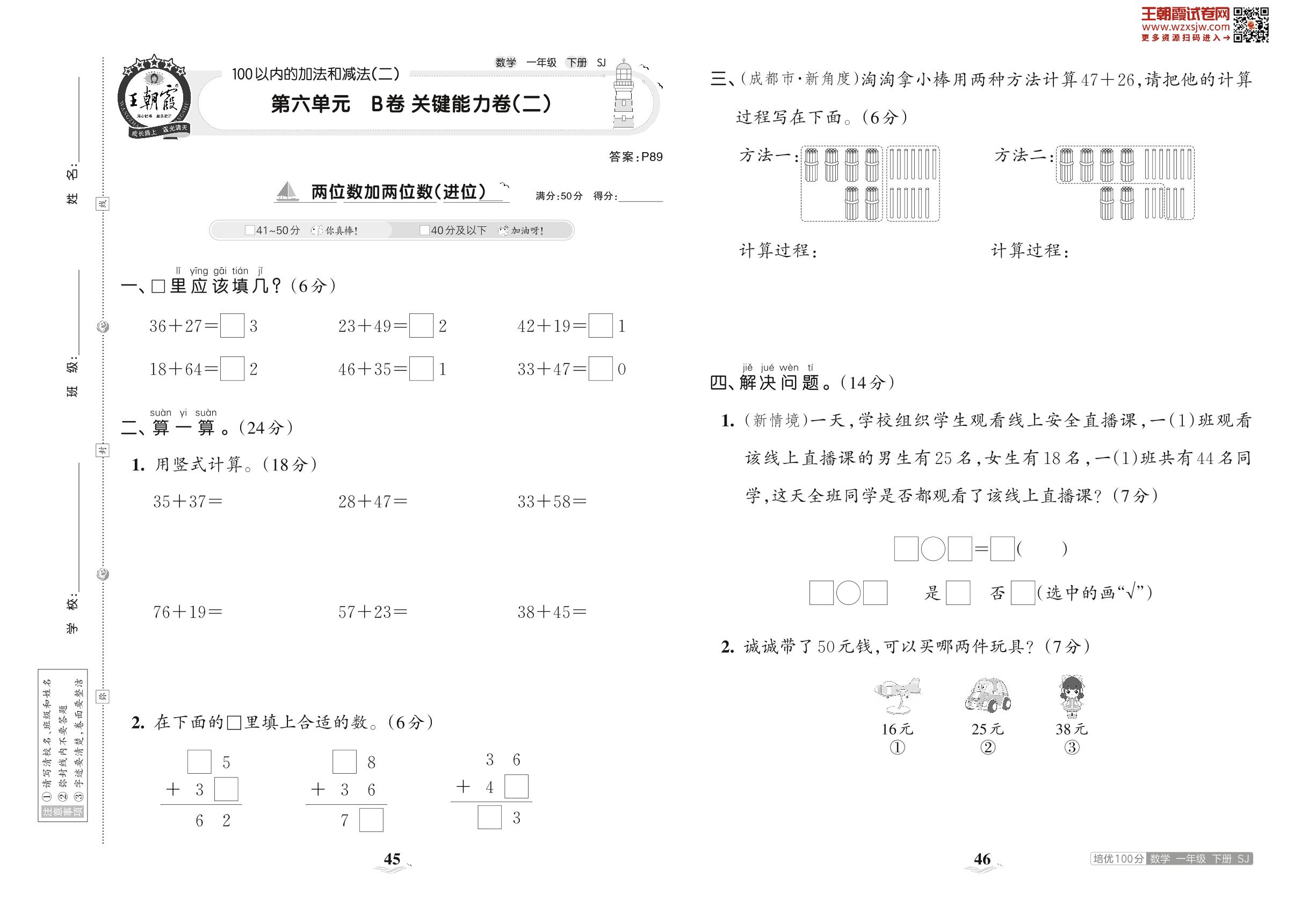 2023下册一年级数学苏教版 第六单元 B卷 关键能力卷(二)