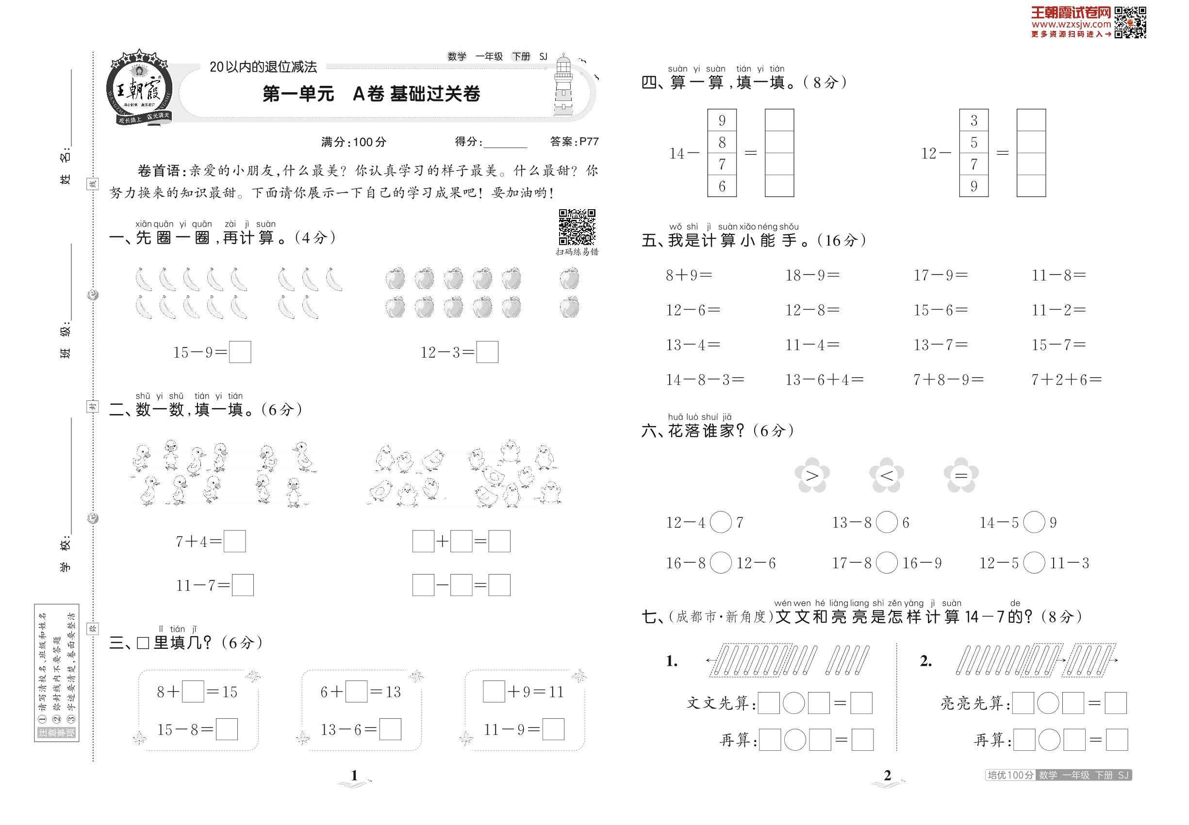 2023下册一年级数学苏教版 第一单元 A卷 基础过关卷