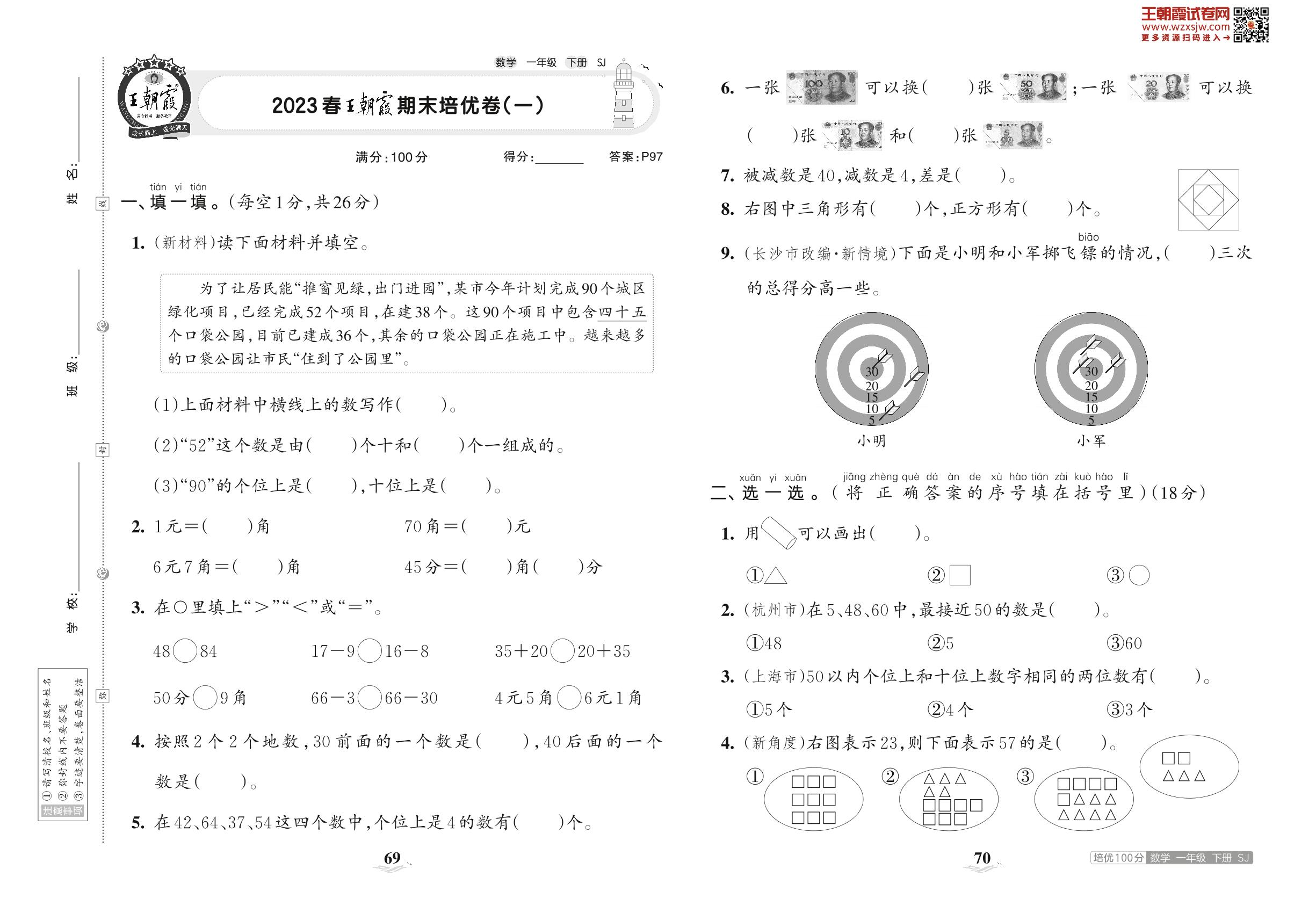 2023下册一年级数学苏教版 2023春王朝霞期末培优卷(一)