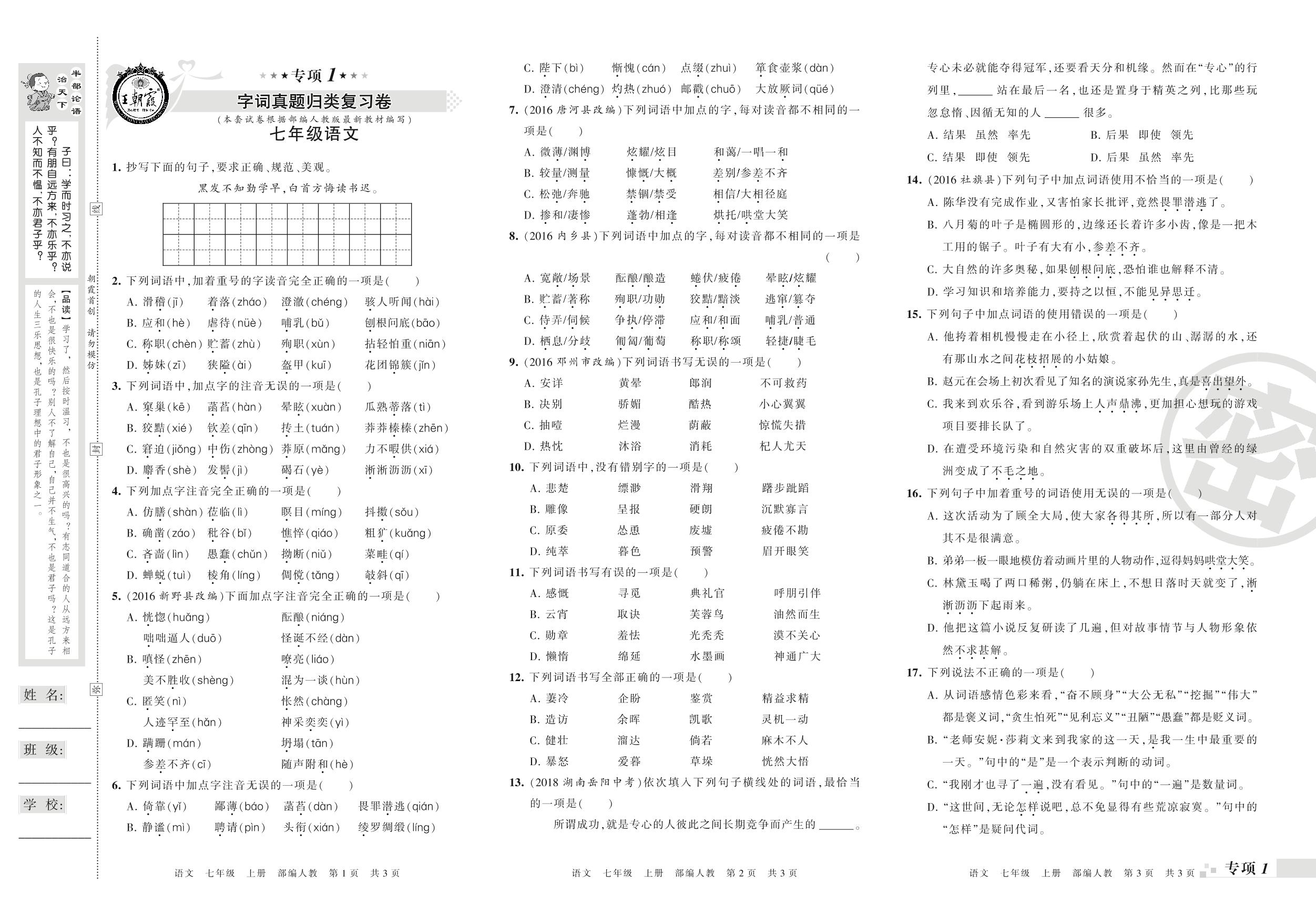 王朝霞期末专项卷——字词、句子真题归类复习卷七年级上册语文(人教版)_R210802162311【0】