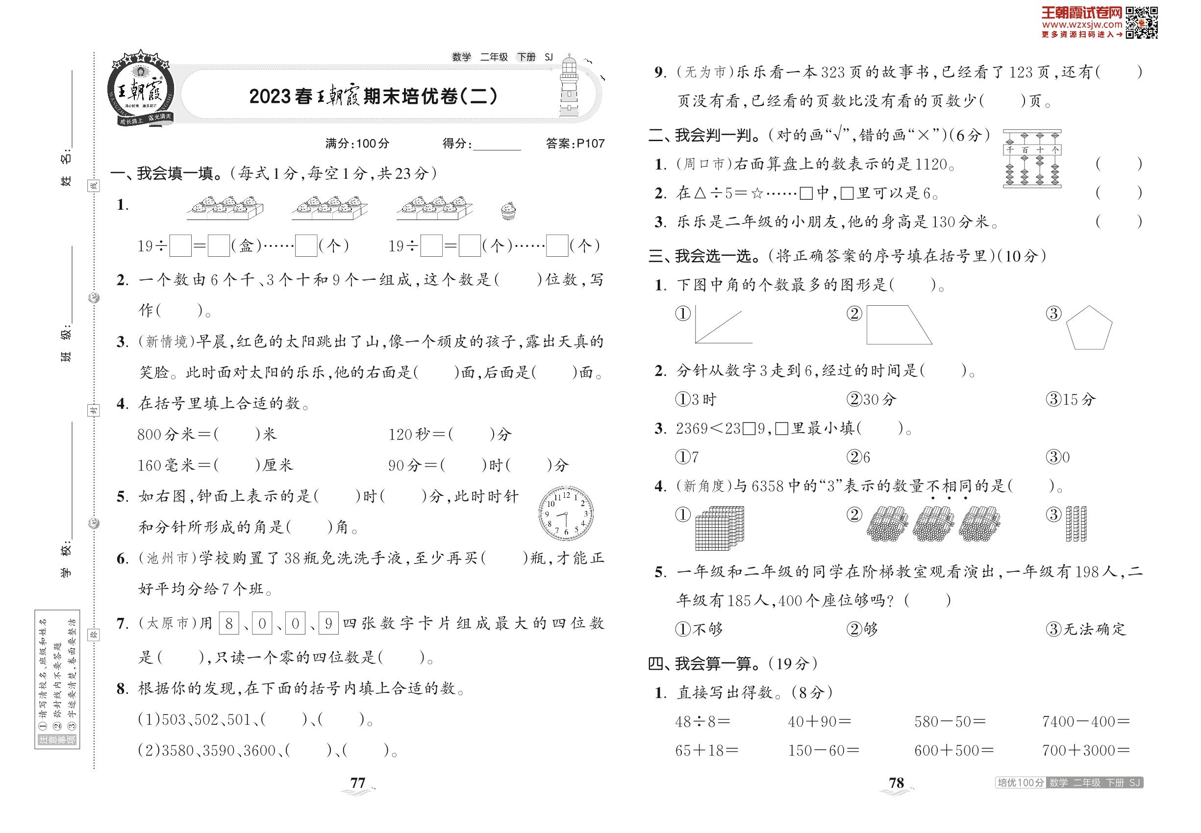 2023下册二年级数学苏教版 2023春王朝霞期末培优卷(二)