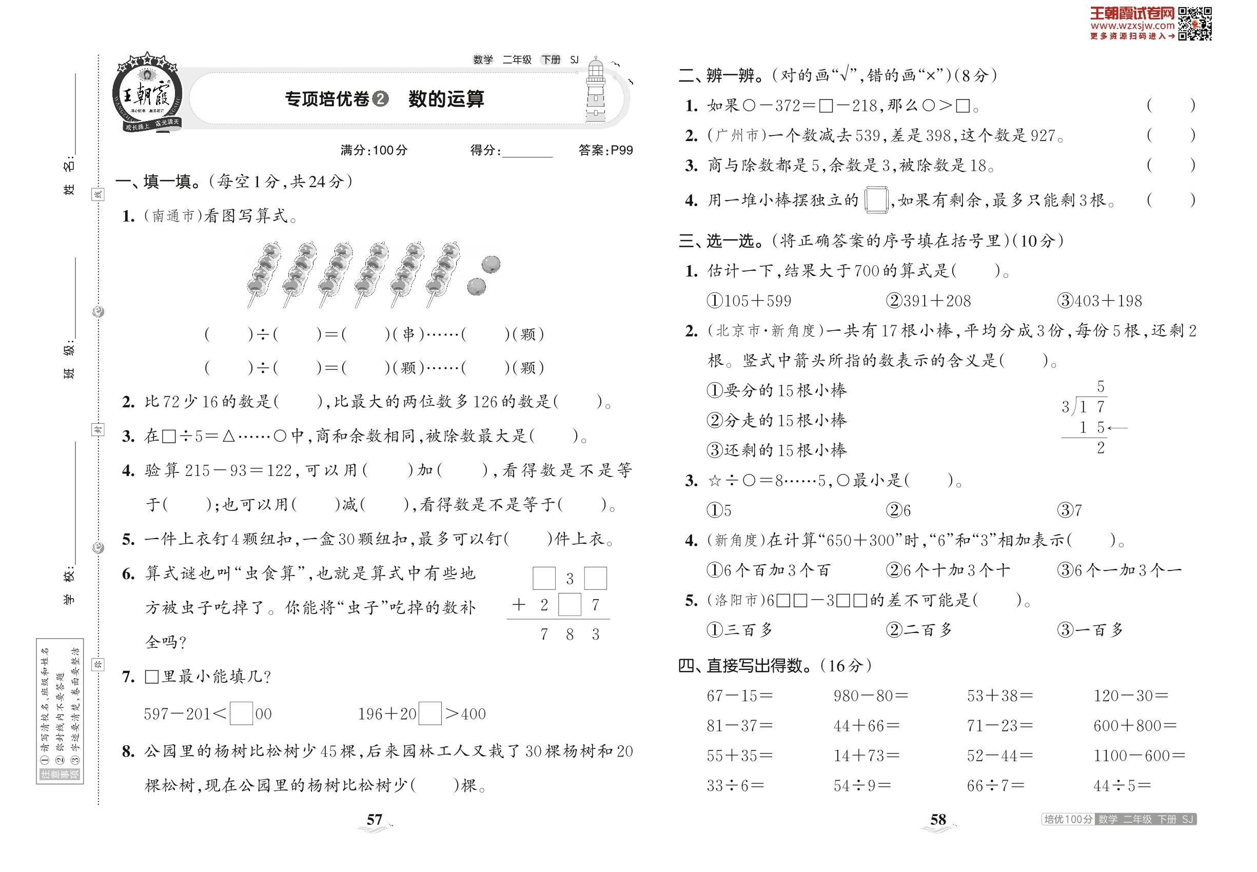2023下册二年级数学苏教版 专项培优卷2 数的运算