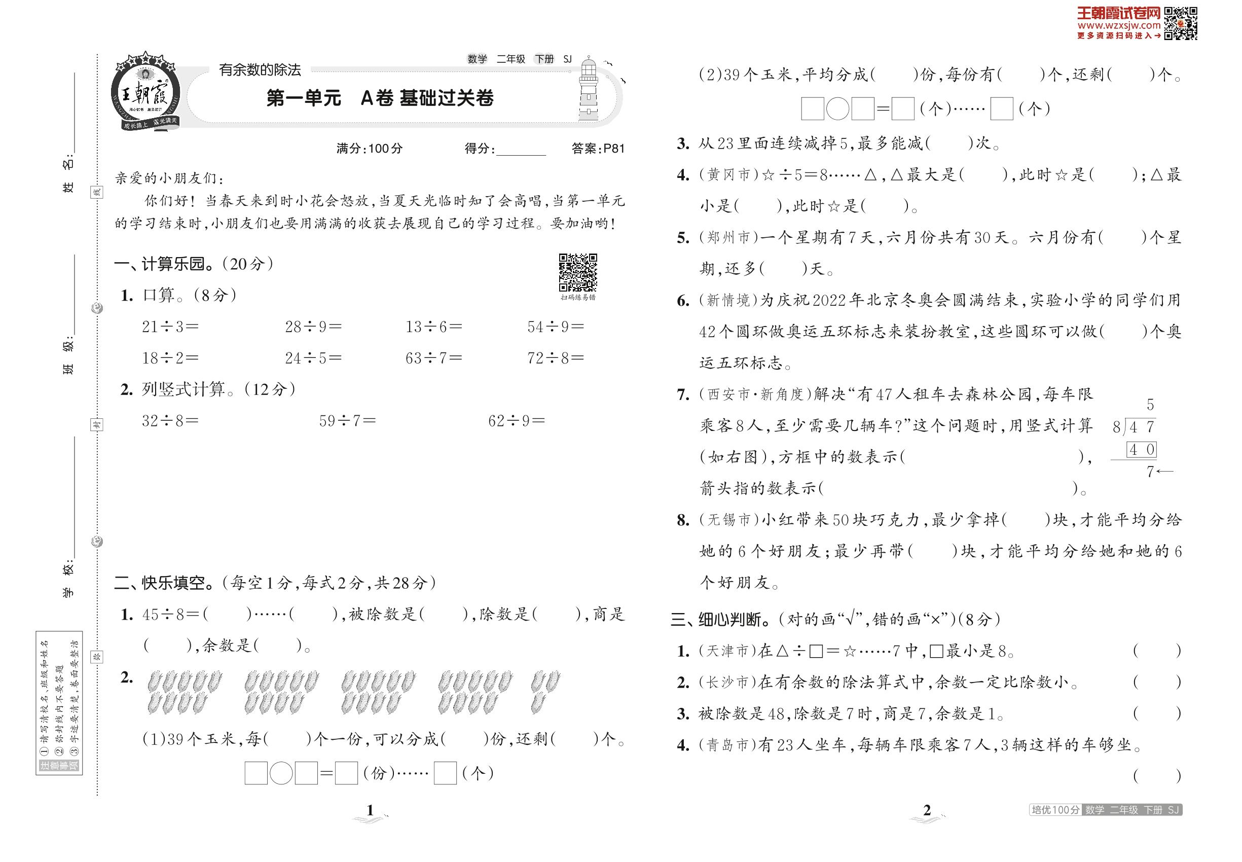 2023下册二年级数学苏教版 第一单元 A卷 基础过关卷