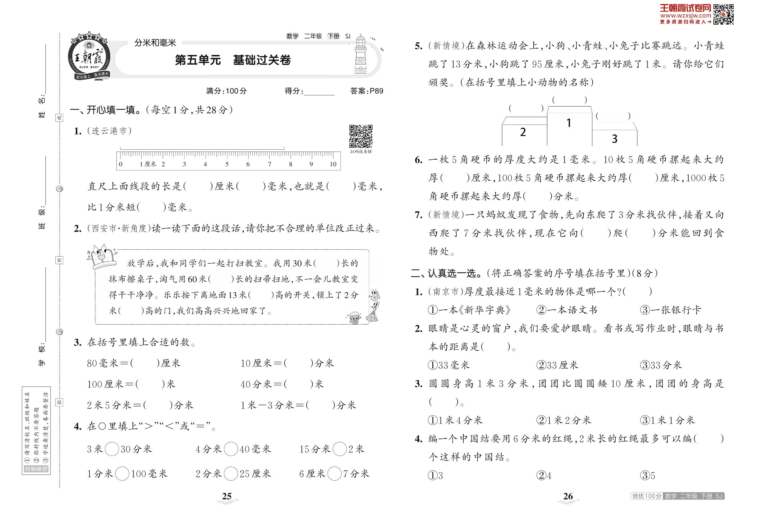 2023下册二年级数学苏教版 第五单元 基础过关卷