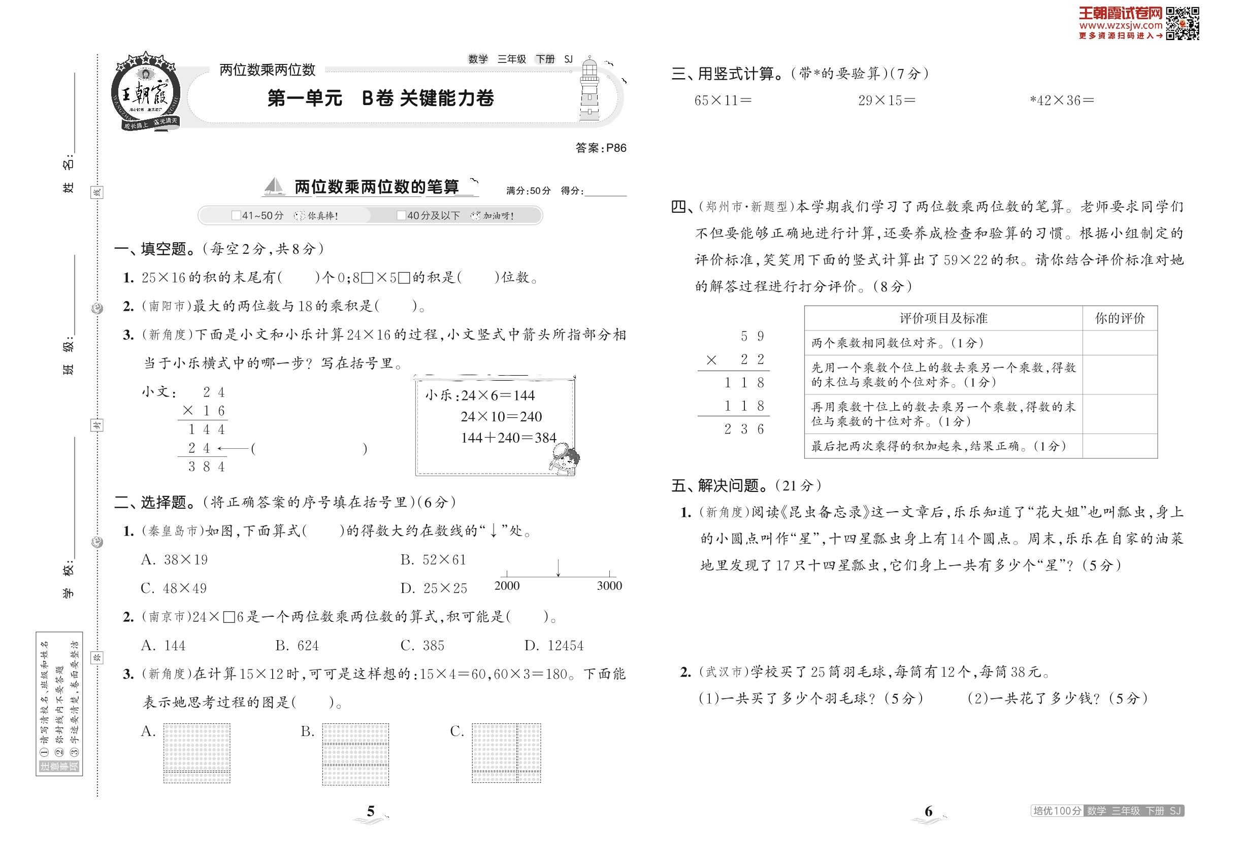 2023下册三年级数学苏教版 第一单元 B卷 关键能力卷