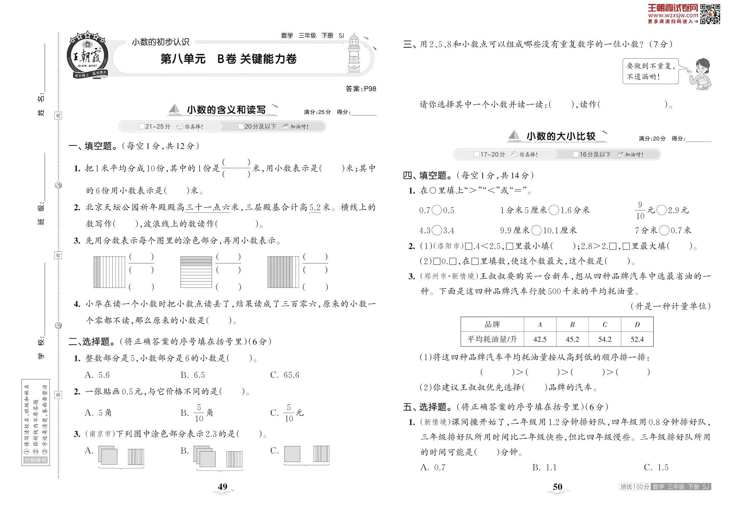 2023下册三年级数学苏教版 第八单元 B卷 关键能力卷