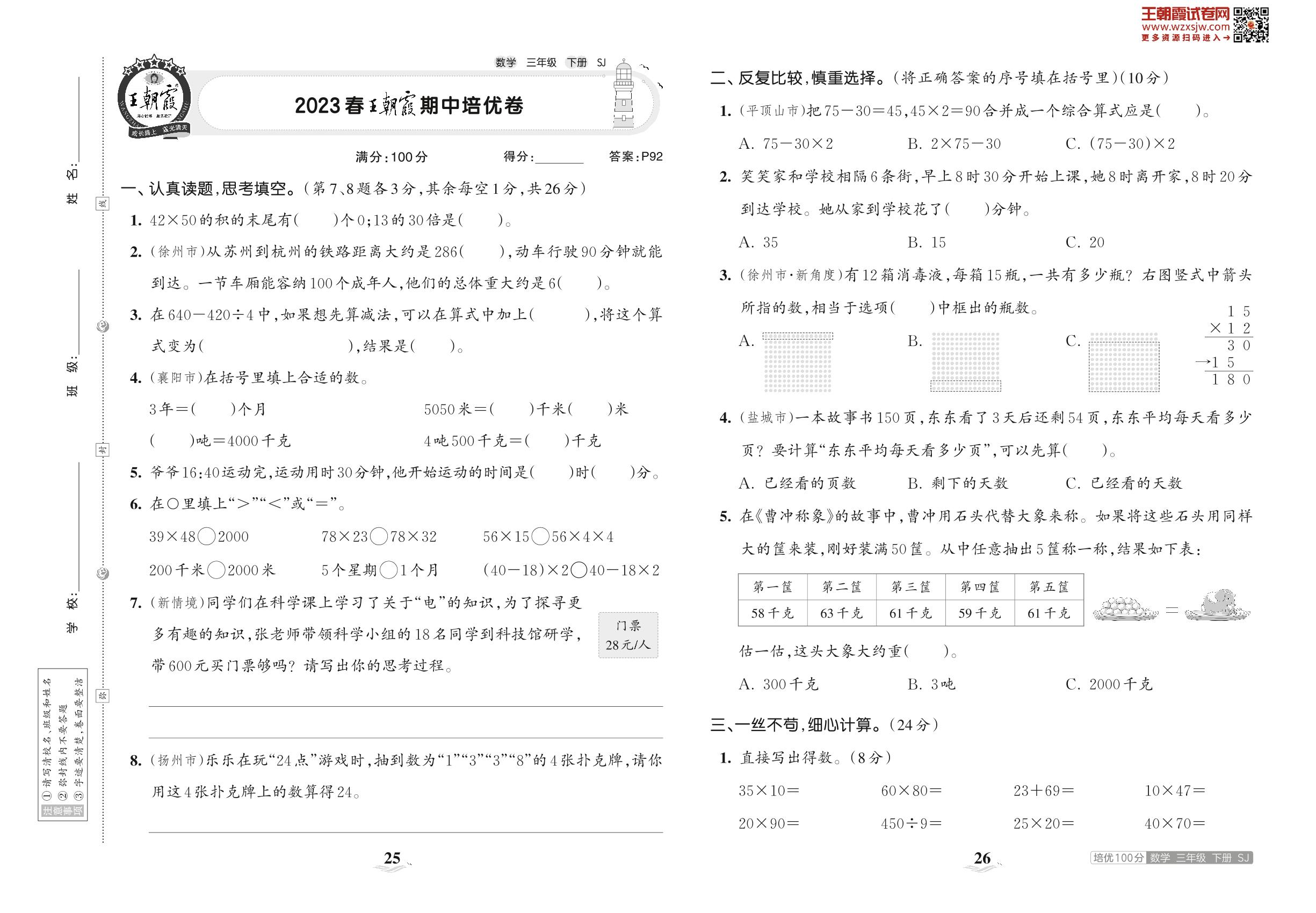 2023下册三年级数学苏教版 2023春王朝霞期中培优卷