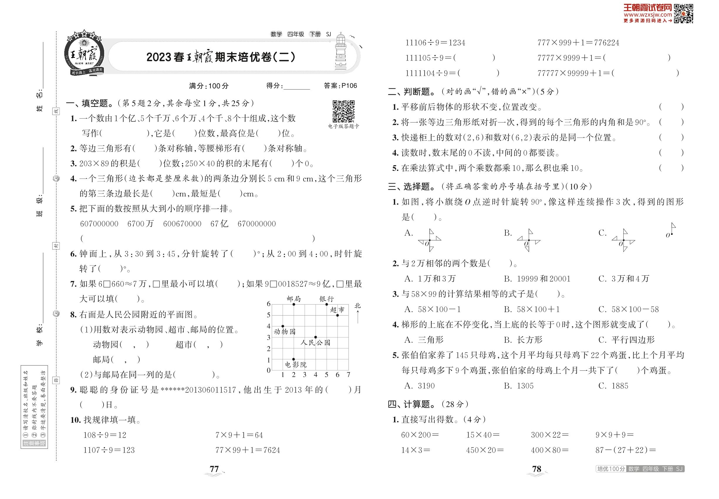 2023下册四年级数学苏教版 2023春王朝霞期末培优卷(二)