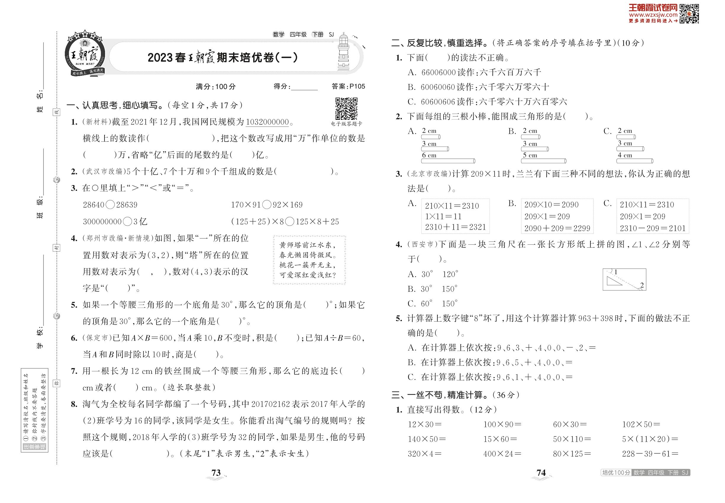 2023下册四年级数学苏教版 2023春王朝霞期末培优卷(一)