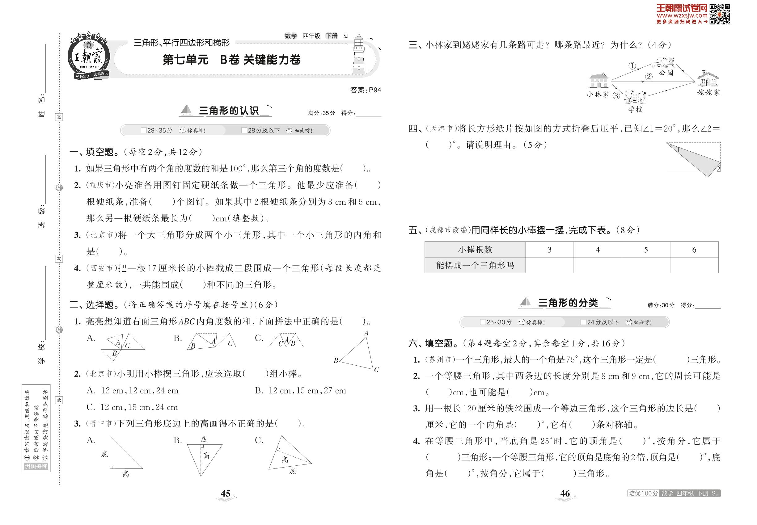 2023下册四年级数学苏教版 第七单元 B卷 关键能力卷
