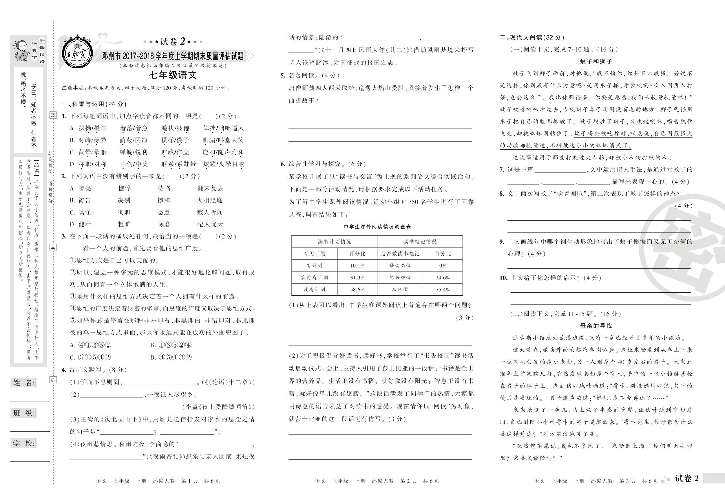 2017-2018学年第一学期邓州市七年级语文试卷(人教版)【2】