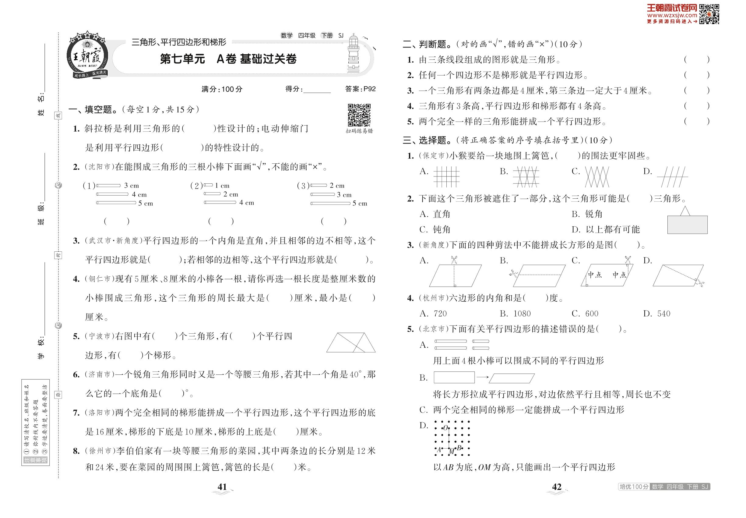 2023下册四年级数学苏教版 第七单元 A卷 基础过关卷