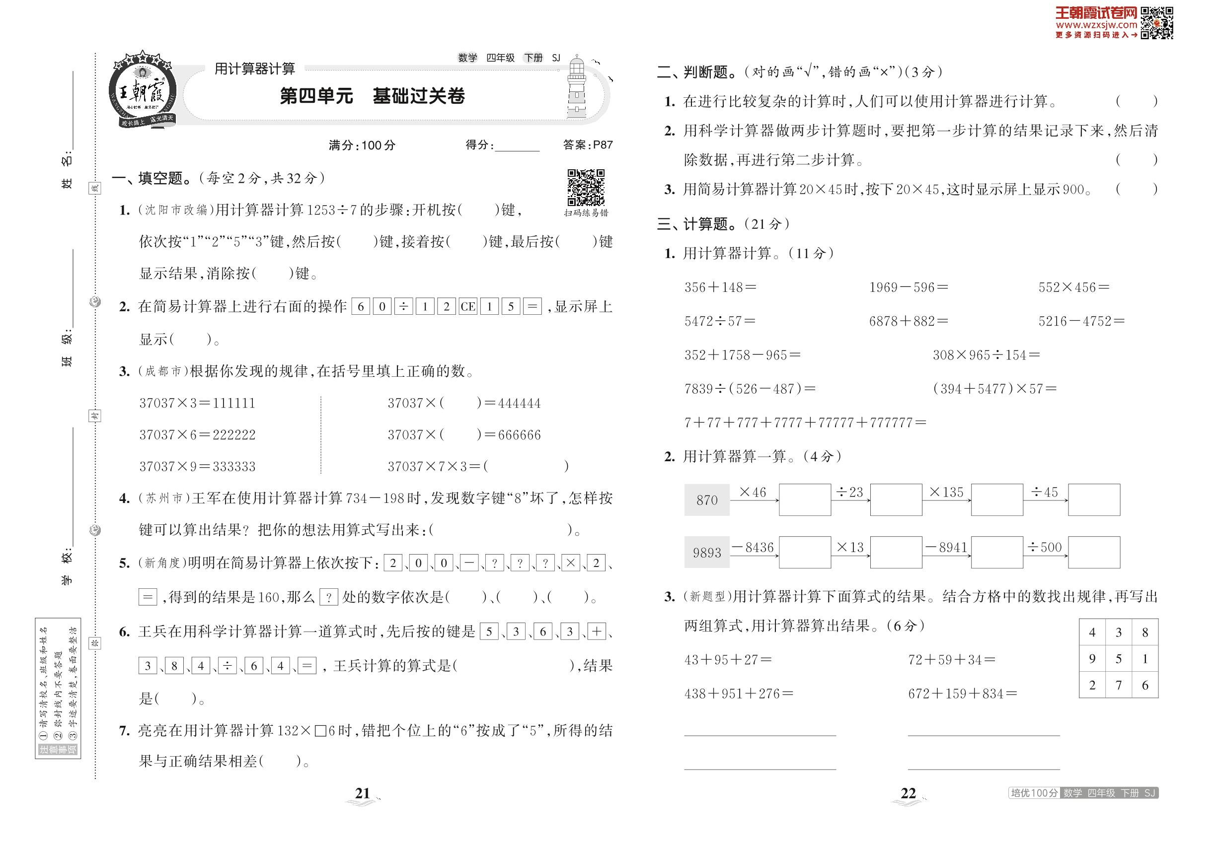 2023下册四年级数学苏教版 第四单元 基础过关卷