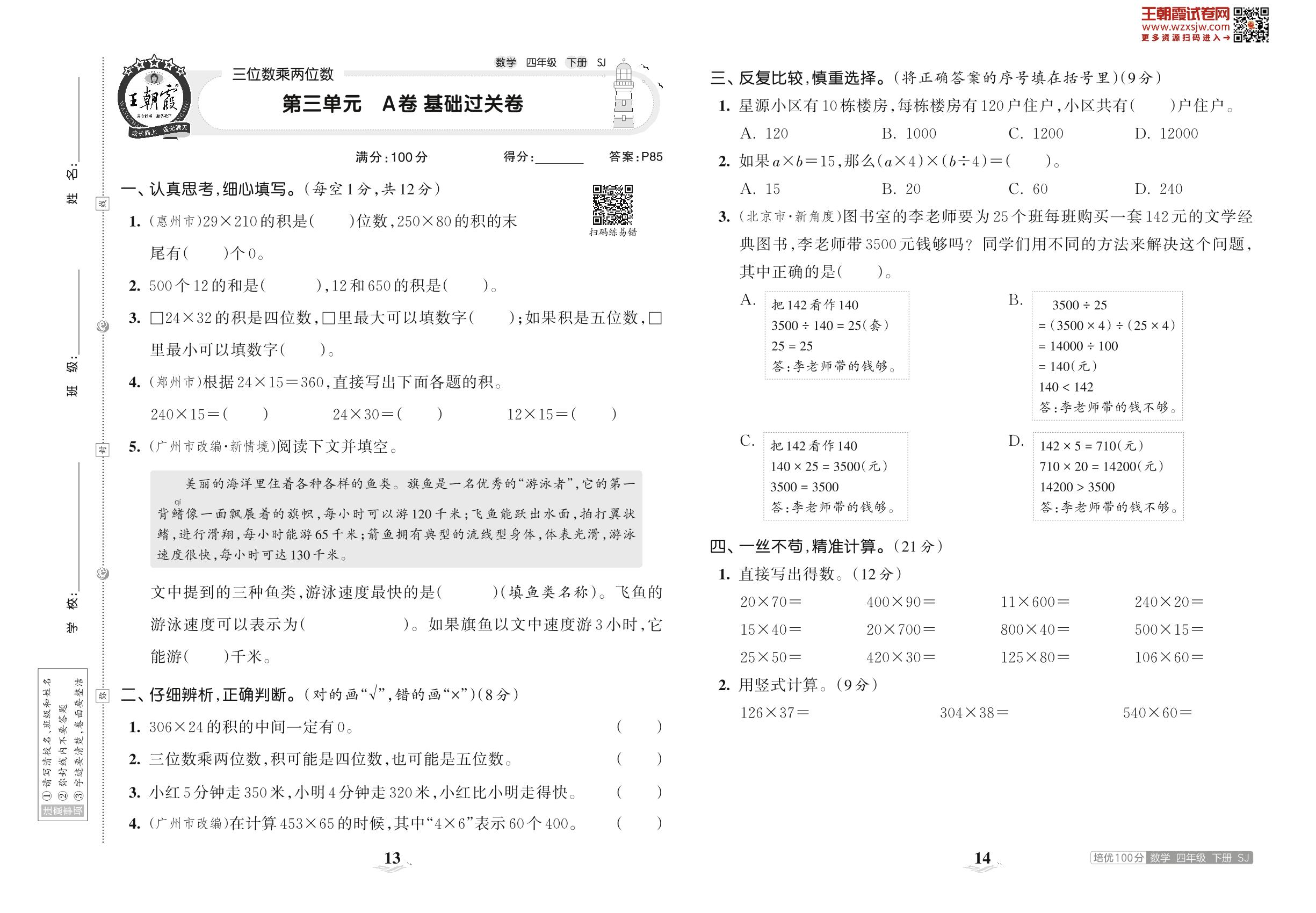 2023下册四年级数学苏教版 第三单元 A卷 基础过关卷