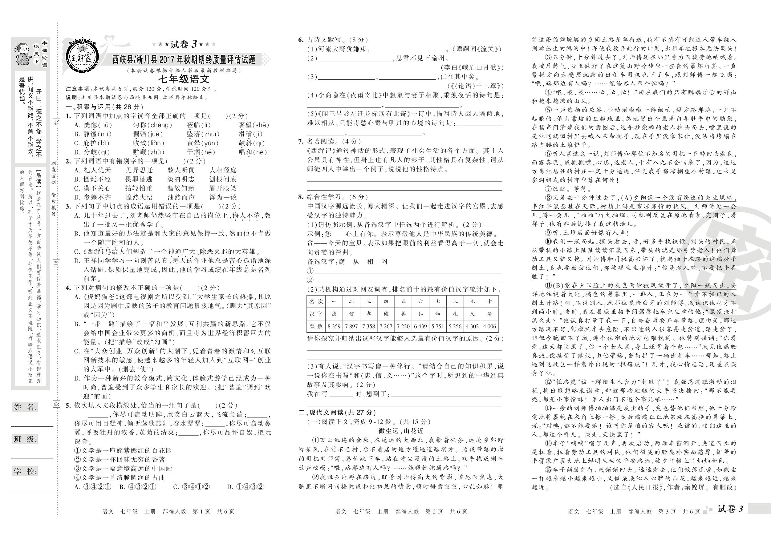 2017-2018学年第一学期南阳市西峡县、淅川县七年级语文试卷(人教版)【3】