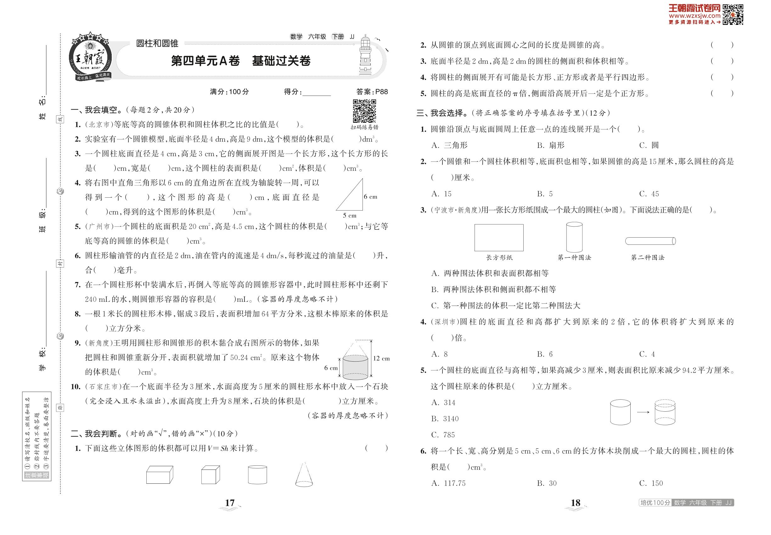 2023下册六年级数学冀教版 第四单元 A卷 基础过关卷