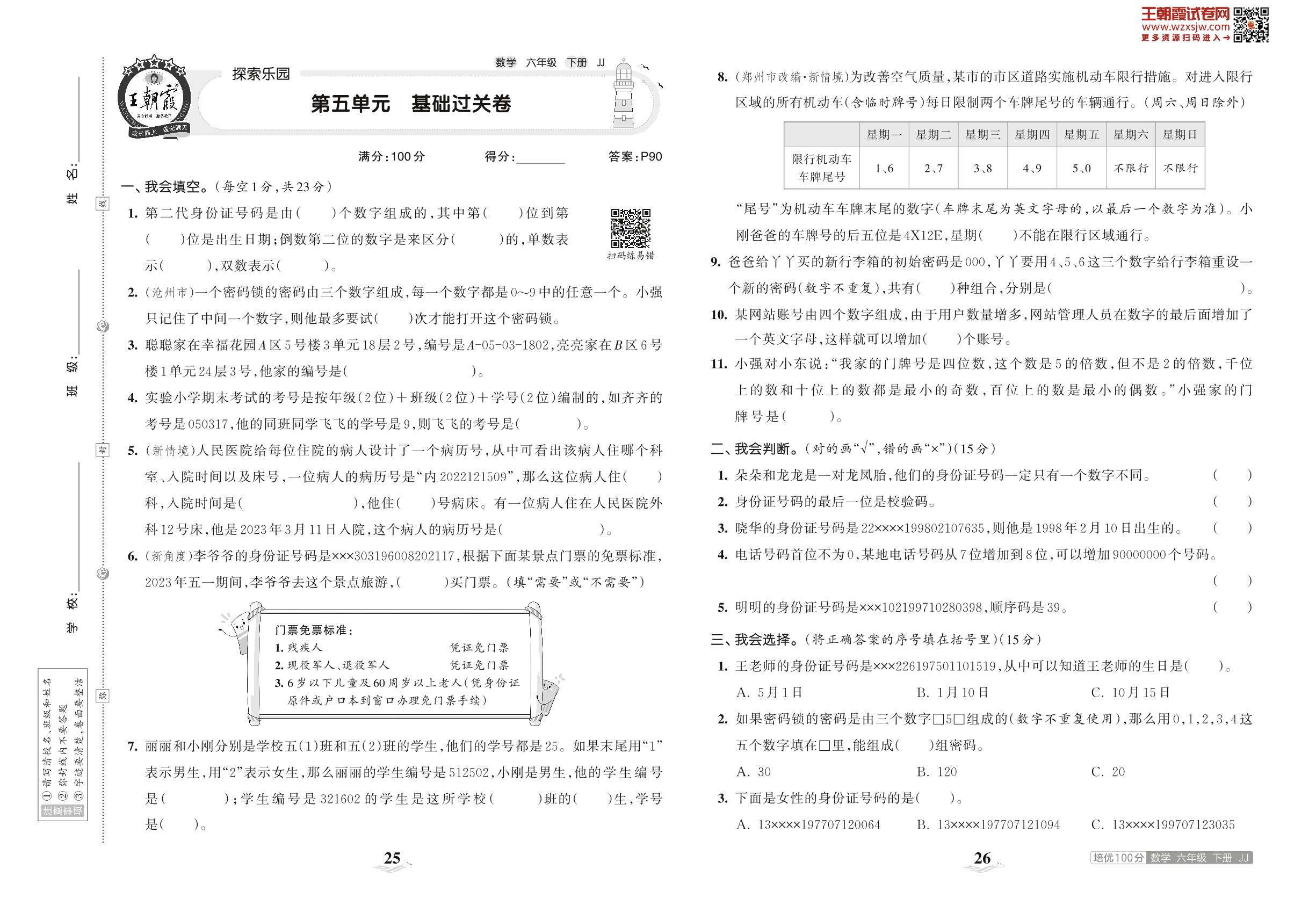 2023下册六年级数学冀教版 第五单元 基础过关卷