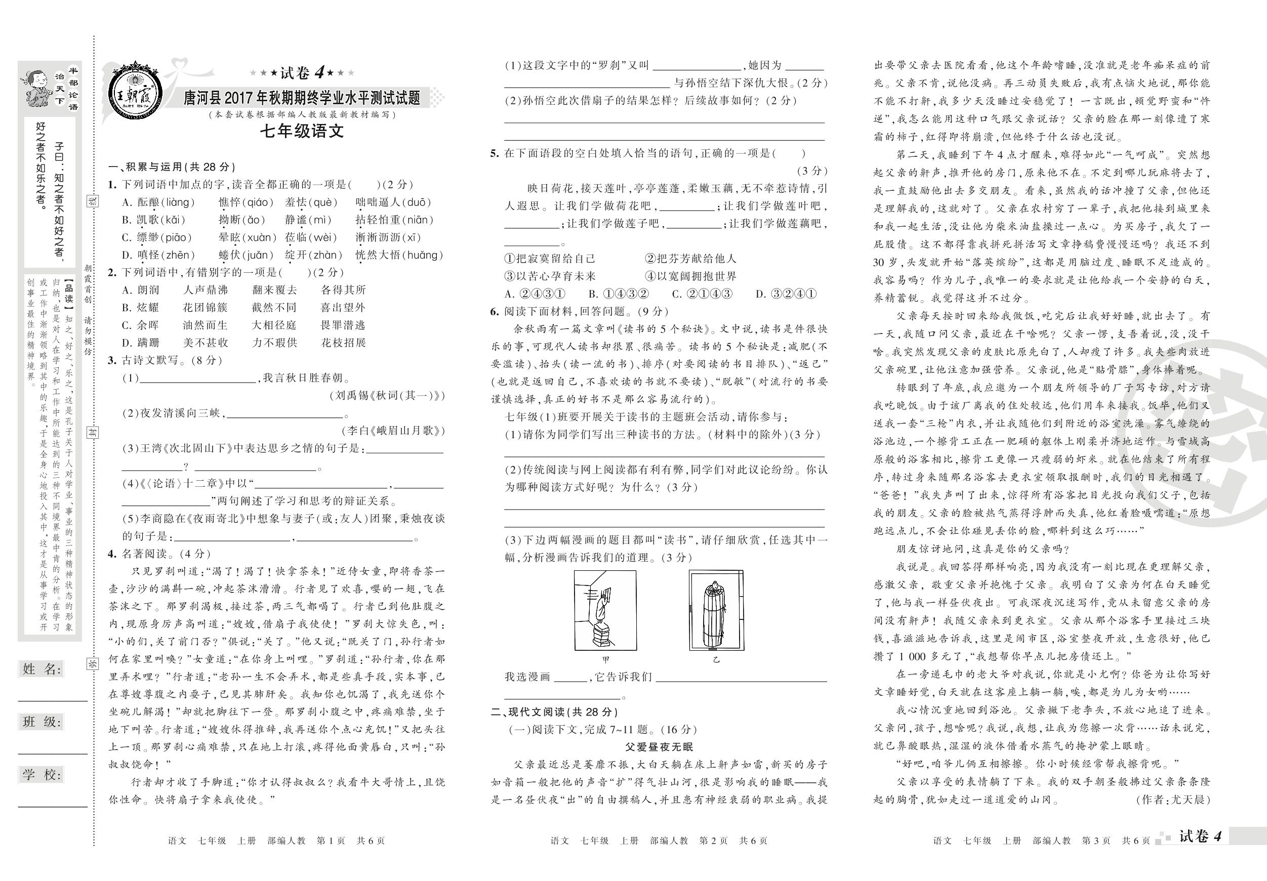 2017-2018学年第一学期南阳市唐河县七年级语文试卷(人教版)【4】