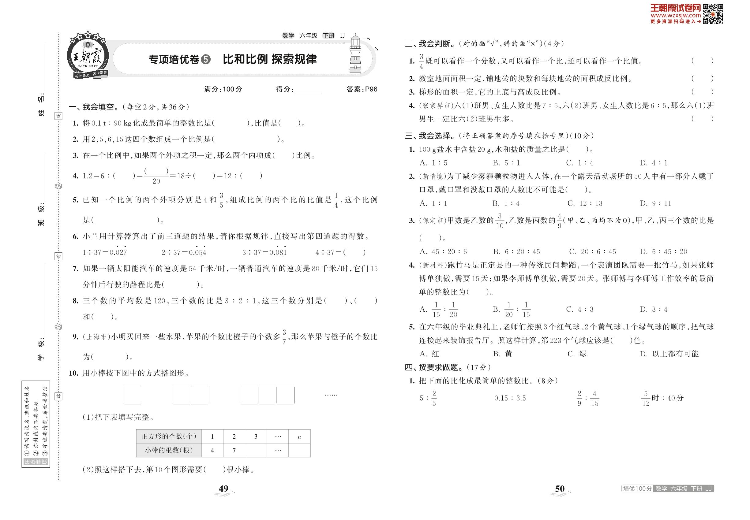 2023下册六年级数学冀教版 专项培优卷5 比和比例 探索规律