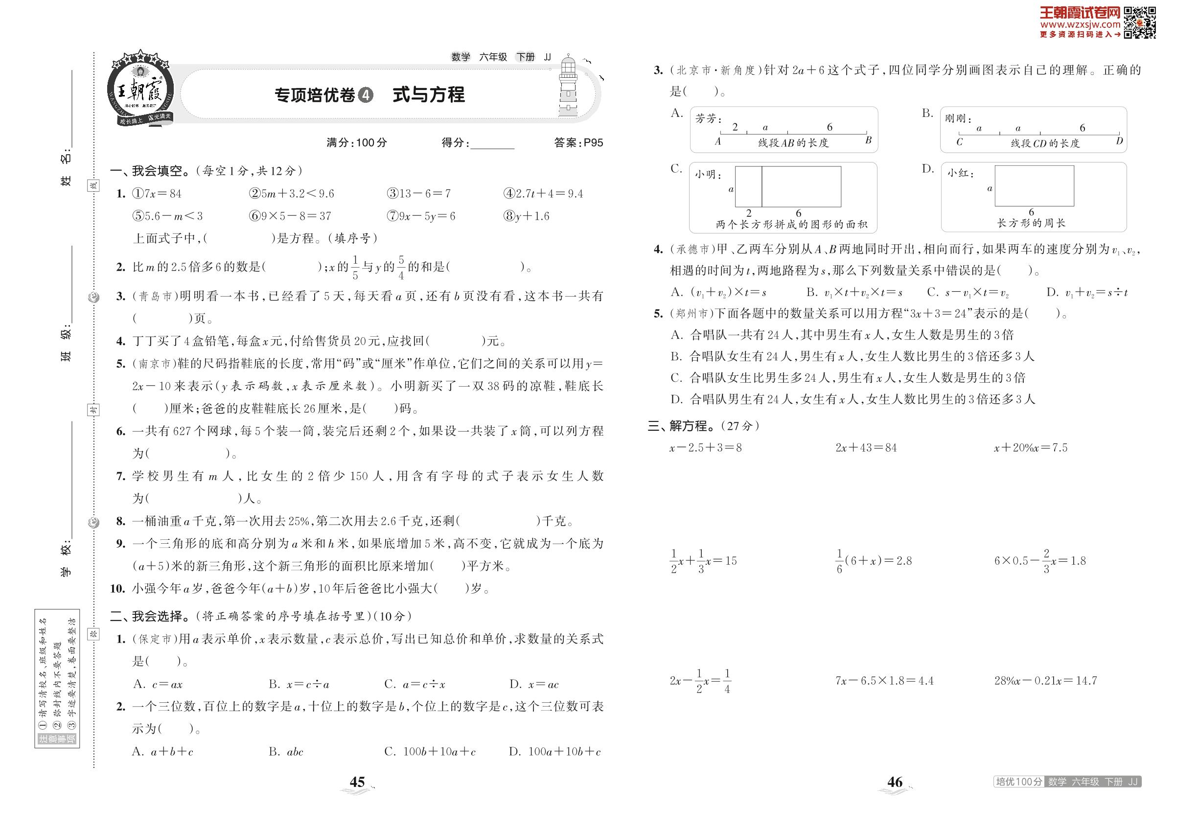 2023下册六年级数学冀教版 专项培优卷4 式与方程