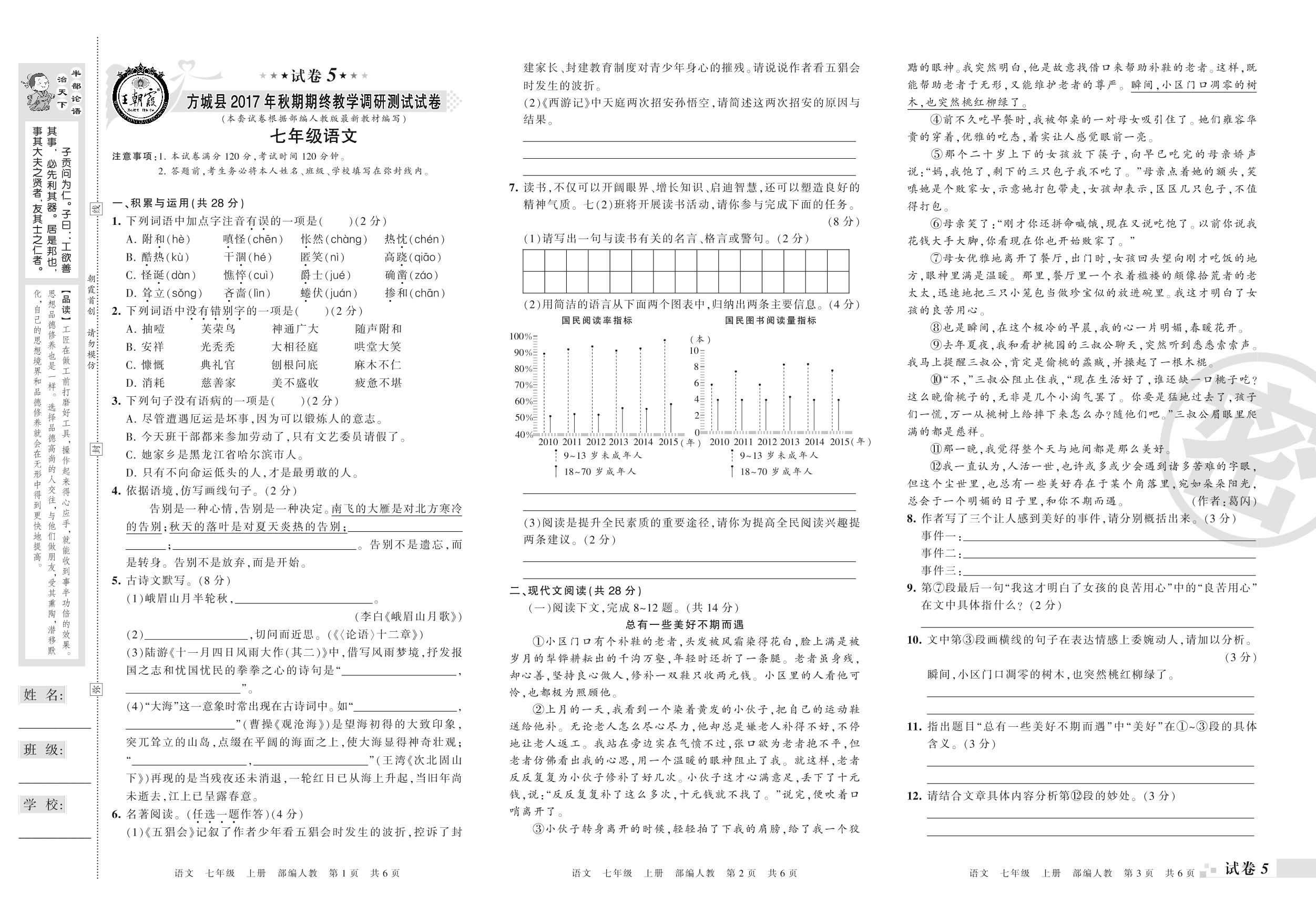 2017-2018学年第一学期南阳市方城县七年级语文试卷(人教版)【5】