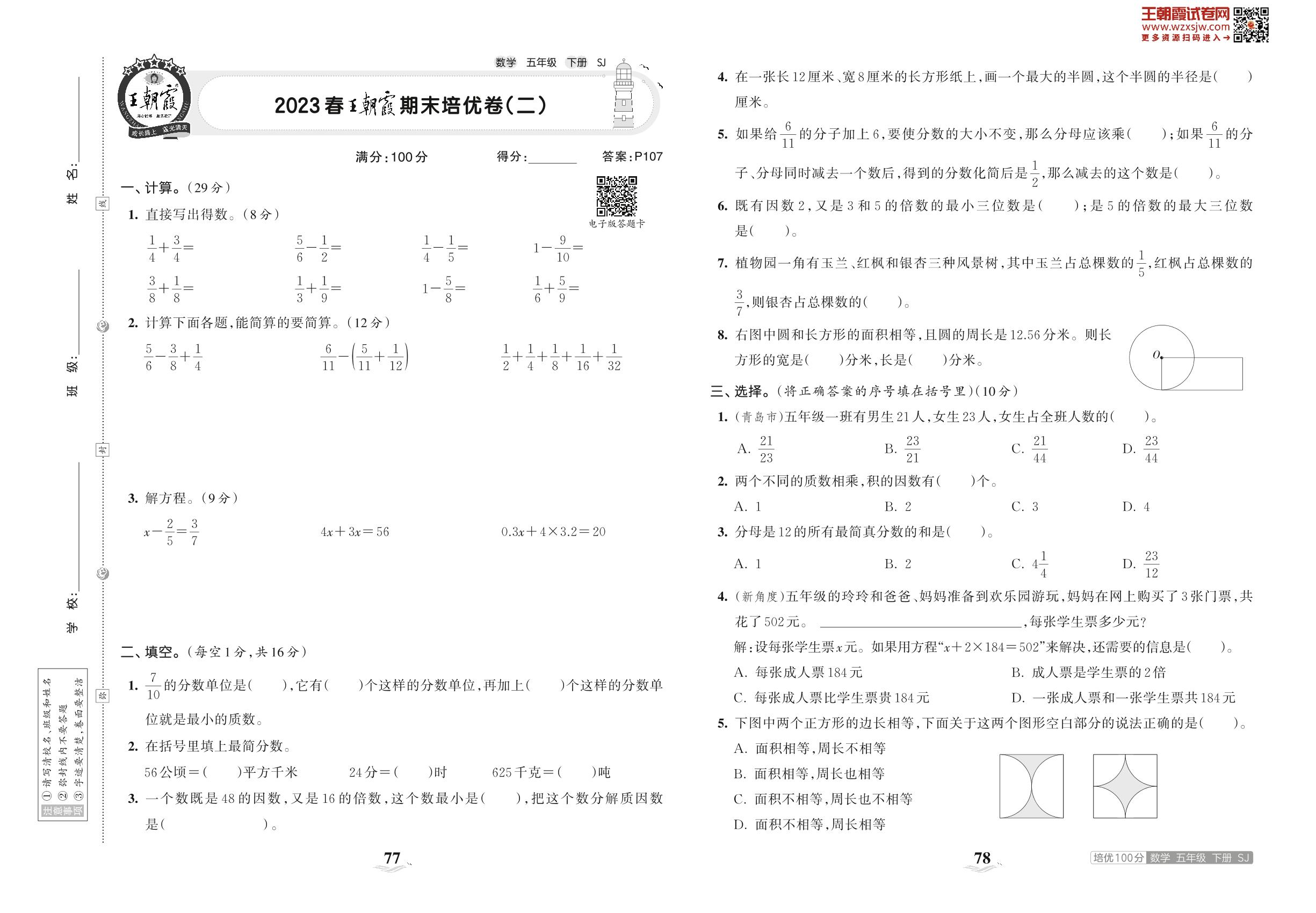 2023下册五年级数学苏教版 2023春王朝霞期末培优卷(二)