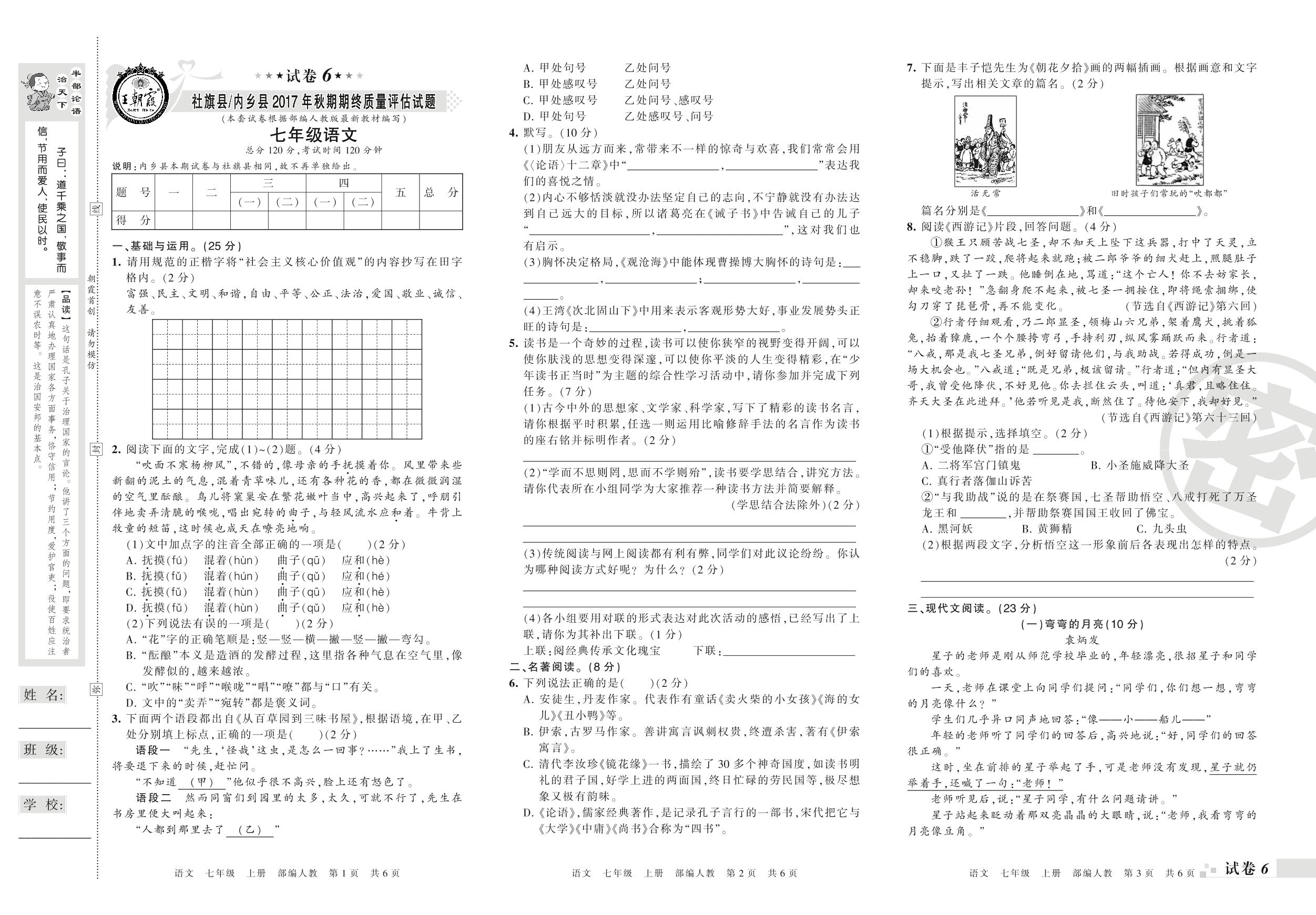 2017-2018学年第一学期南阳市社旗县、内乡县七年级语文试卷(人教版)【6】