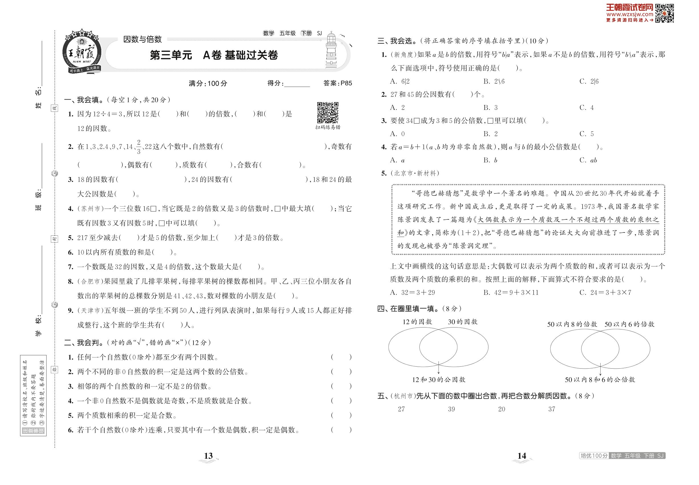 2023下册五年级数学苏教版 第三单元 A卷 基础过关卷