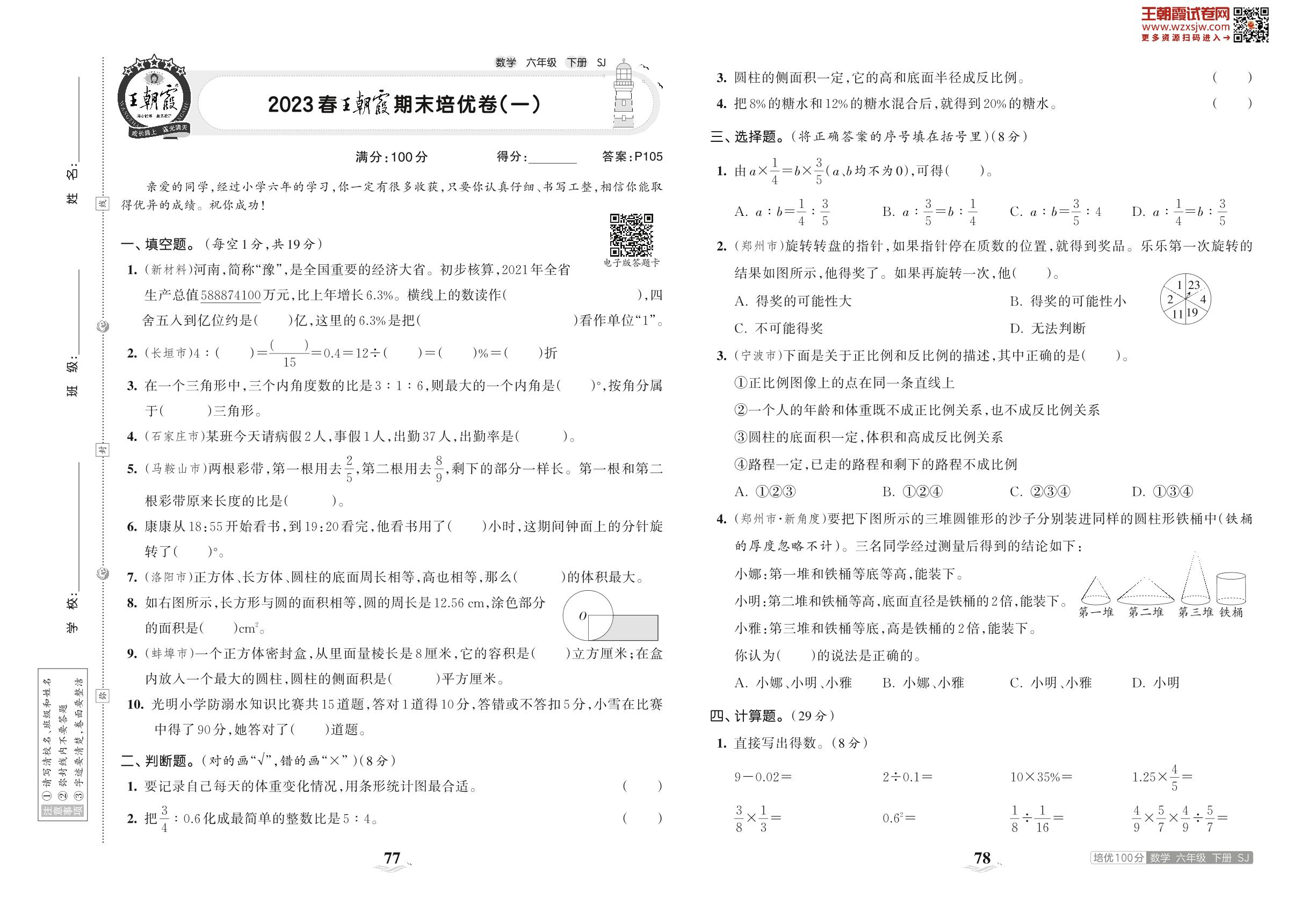 2023下册六年级数学苏教版 2023春王朝霞期末培优卷(一)