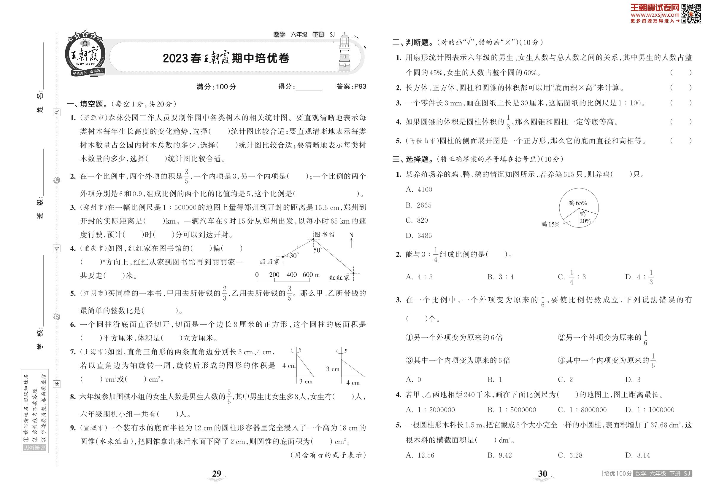 2023下册六年级数学苏教版 2023春王朝霞期中培优卷