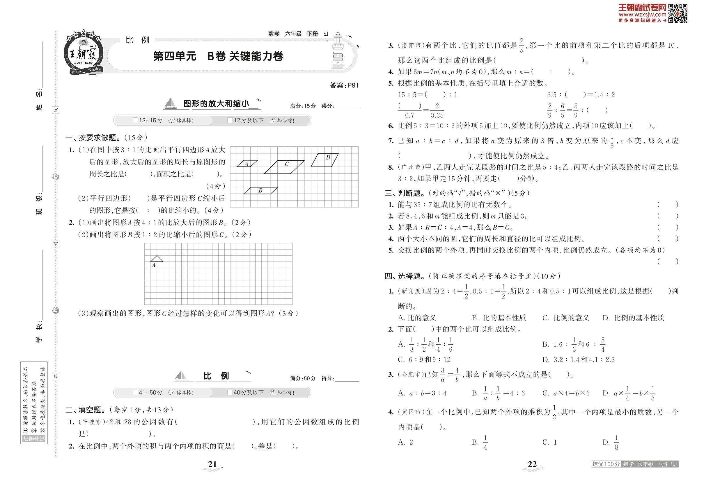 2023下册六年级数学苏教版 第四单元 B卷 关键能力卷