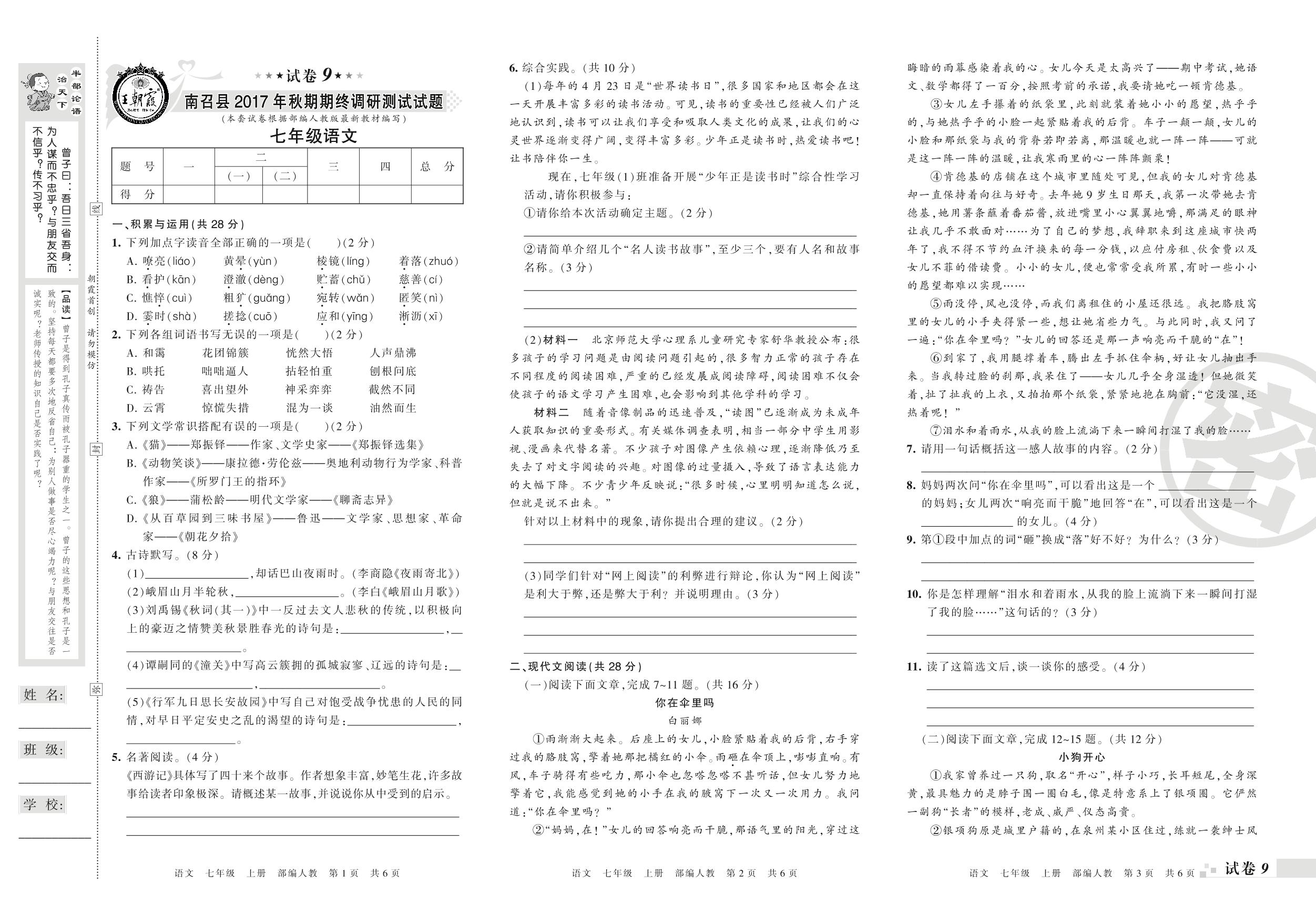 2017-2018学年第一学期南阳市南召县七年级语文试卷(人教版)【9】